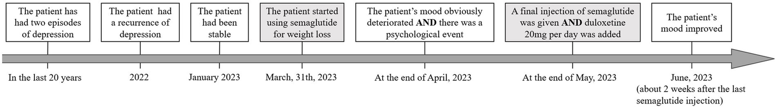 Her endocrinologist added semaglutide to the diabetic treatment on March 31, 2023. The weekly dosage was 0.25 mg in the first 4 weeks and then increased to 0.5 mg. She had decreased appetite and lost 4 kg of body weight in 2 months after taking semaglutide. The blood glucose was more stable, and the usage of insulin was reduced to 70% of the previous dosage. At the end of April, her mood obviously deteriorated. During the same period, she had some disagreements with her mother. The doctor and the patient agreed to work on this issue, as similar situations had happened before and her condition improved with psychotherapy. But within the next month, her mood deteriorated further. She also developed fatigue, slowing of mind, increased need for sleep, and recurrence of suicidal ideation. The symptoms were similar to previous depressive episodes. From mental state examination, a relapse of severe depression was established. This was unusual considering a past history of positive psychotherapeutic response. At the end of May, semaglutide was stopped for cautious considerations in consultation with her endocrinologist, and duloxetine 20 mg per day was added to escitalopram 20 mg per day. The patient’s mood improved about 2 weeks after the last semaglutide injection. At a follow-up visit on July 18, her condition continued to improve, to which the patient was pleased with the recovery. The patient’s feedback was that her mood has been improving from 2/10 to 5/10 (a subjective feeling of happiness), and her suicidal thoughts have almost disappeared. She continues to worry about enhanced appetite and increased body weight (1 kg in 2 weeks). The timeline of case 2 is shown in Figure 2.