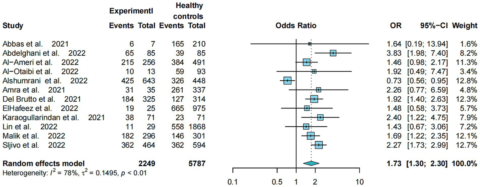 The Odds Ratio (OR) of the 12 comparative studies on the prevalence of poor sleep quality between COVID-19 patients and healthy controls is shown in Figure 2. Specifically, COVID-19 patients had a higher risk of poor sleep quality compared to healthy controls (OR = 1.73, 95% CI: 1.30–2.30, p < 0.01, I2 = 78.1%). Moreover, COVID-19 patients had significantly higher PSQI total scores than healthy controls, with a large effect size (SMD = 0.31, 95%CI: 0.07–0.55, p < 0.0001, I2 = 92%) (Supplementary Figure S3).