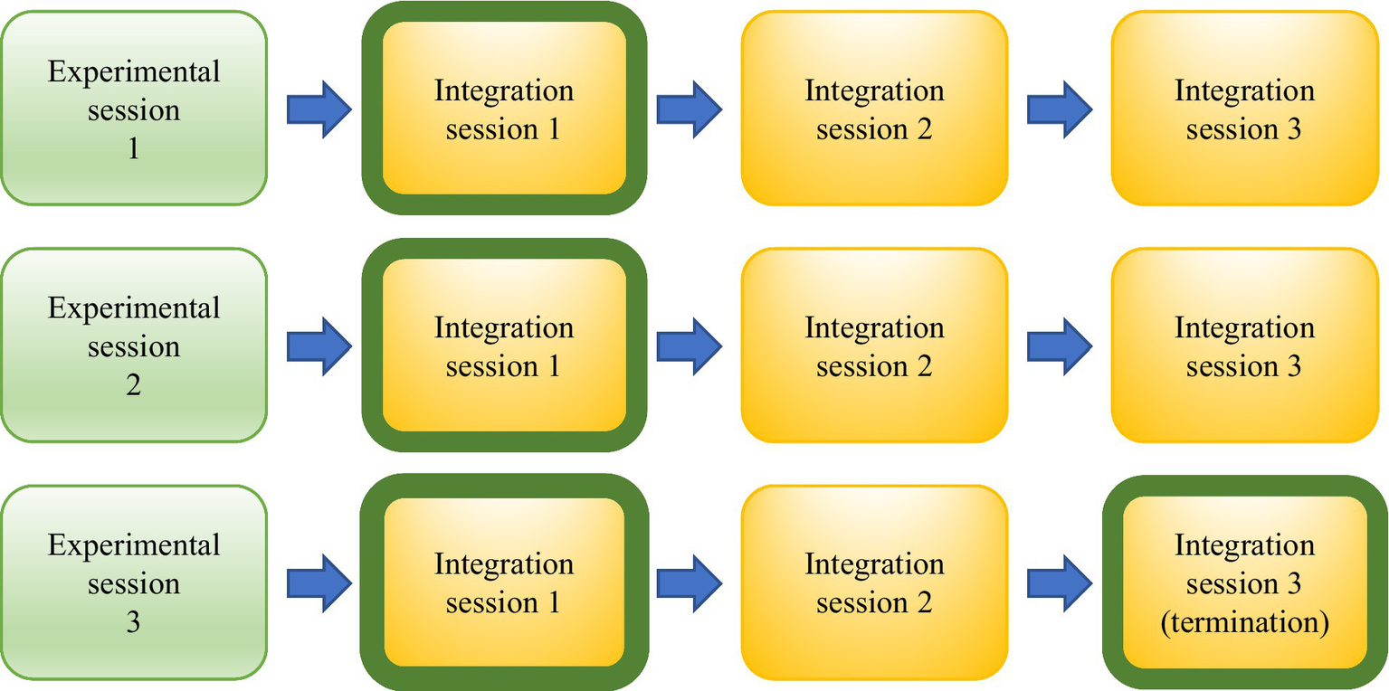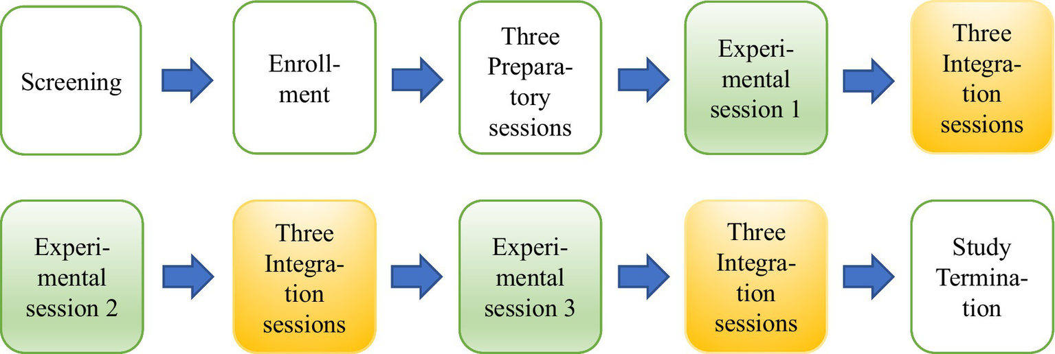 Each participant underwent a recorded treatment consisting of 15 sessions divided over 12 weeks. The treatment protocol embodied three different types of sessions (Figure 1). Three experimental MDMA sessions took place in which either 80 mg or 120 mg is orally administered with an optional supplemental dose of 40 mg or 60 mg. In these 6–8-h long sessions, addressing PTSD symptoms and processing the trauma is an essential part. After each MDMA session, three integration meetings took place. See Figures 1, 2 for the treatment design and procedure. More information on the treatment procedure and protocol is found in the ‘Manual for MDMA-AP for the treatment of post-traumatic stress disorder (15).