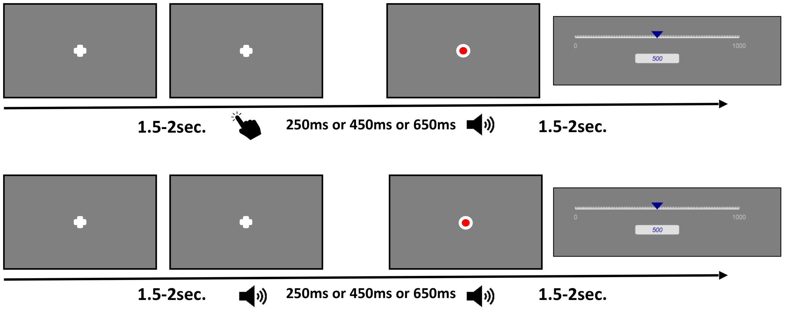 For methodological reasons, we did not perform outlier checks or outlier removals. Temporal binding is a time estimation bias (Engbert et al., 2008) between actions and subsequent events and is sometimes referred to as a “temporal magnitude estimation” (48, 49). Typically, temporal binding paradigms do not involve practice or memorization trials during which participants learn specific durations. Tasks primarily directed at time perception usually require memorized durations as reference intervals from which individuals or groups digress during different experimental manipulations. Notably, our paradigm lacked such a controlled reference interval. As a result, participants’ results are prone to anchoring effects (34, 35) which make it difficult to compare estimates to real judgements, and to investigate differences in interindividual differences in time perception.