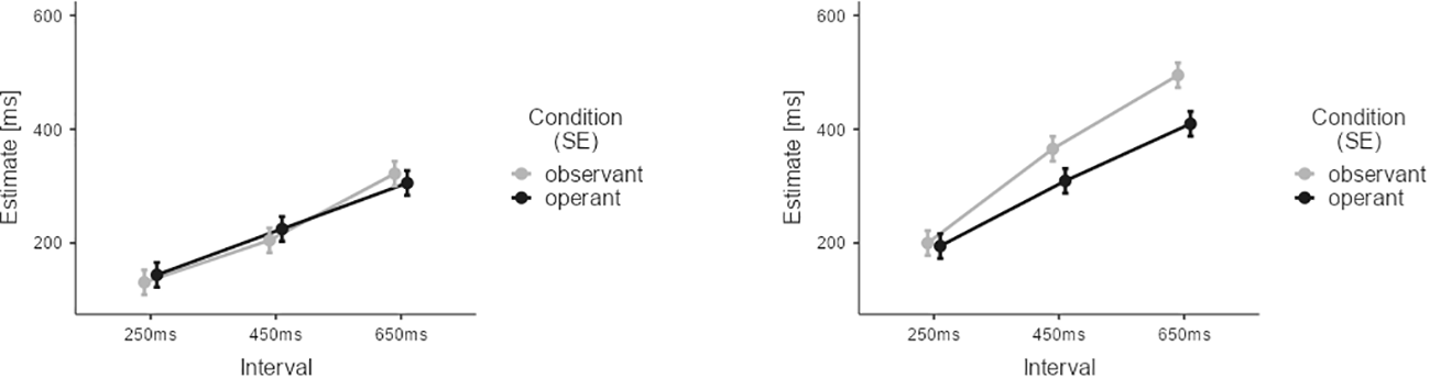 This unexpected finding was driven by an increase of time estimates in the patient group for the operant visual conditions (compared to the observant visual conditions), while the time estimates in these conditions did not differ for CG participants, resulting in a significant interaction between DIAGNOSIS and AGENCY (M=-38.82, SE= 9.26, t=-4.19, p<0.001).