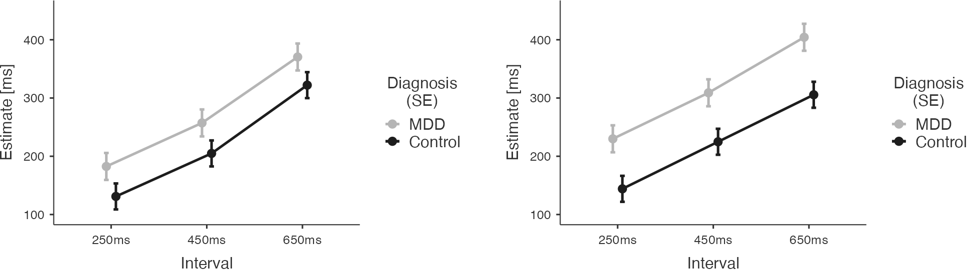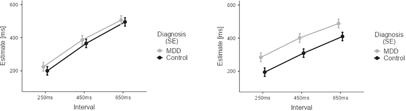 Effects of experimental manipulations on time estimates were analyzed using a linear mixed effects model as recommended for repeated measures designs (47) with random effects for participants. Visual inspection of residual plots did not suggest deviations from homoscedasticity or normality. Prior to analysis participants were individually screened for random response behavior. All participants showed a linear trend between the three intervals on visual inspection, reflecting their overall engagement in the task and their ability to differentiate intervals.