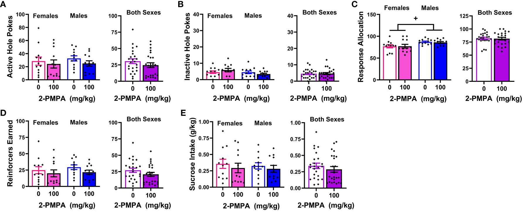 To determine whether the lack of any 2-PMPA effect on MA self-administration in Experiments 1 and 2 reflected insufficient 2-PMPA dosing or the sex of the subjects, Experiment 3 was conducted in which male and female B6 mice were trained to respond for 200 mg/L MA until responding stabilized. Mice were then pretreated IP with either 0, 30 or 100 mg/kg 2-PMPA, with dosing order counterbalanced across mice in a within-subjects design. MA self-administration resumed following each pretreatment and continued until responding re-stabilized, which required 2-3 days for most mice. One female failed to meet the acquisition criteria for MA self-administration and thus, did not undergo 2-PMPA treatment. Following the completion of dose-response testing under MA reinforcement, the MA solution was substituted for a 20% (w/v) sucrose solution and the mice were allowed to self-administer sucrose until responding stabilized (2-4 days for all mice, including the female that failed to acquire MA self-administration). Upon the stabilization of responding for sucrose, the mice were then pretreated with either 0 or 100 mg/kg 2-PMPA (i.e., the highest 2-PMPA dose assayed under MA self-administration procedures), in a counterbalanced fashion across subjects within each sex, with 2-3 days allowed between pretreatments for re-stabilization of responding. For Experiment 3, 2-PMPA was obtained from MedSciExpress USA (Monmouth Junction, NJ, USA) and was soluble in water. Thus, water served as the vehicle for Experiment 3 (vol=10 ml/kg), which avoided the issues associated with the HEPES pretreatment detected in Experiment 2.