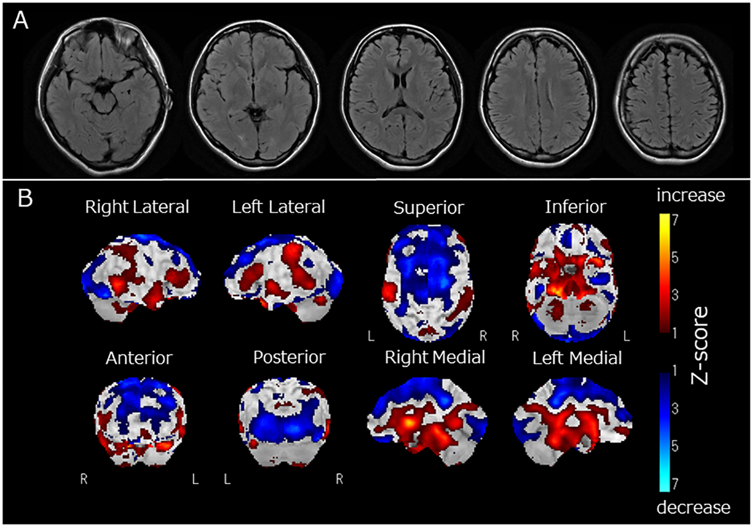 (A) Fluid Attenuated Inversion Recovery magnetic resonance imaging of the brain, (B) regional cerebral blood flow (rCBF) using single-photon emission computed tomography (SPECT) with 123I-iodoamphetamine. Fluid-attenuated inversion recovery magnetic resonance imaging revealed no apparent brain atrophy or high-intensity areas (A). SPECT using a 123I-iodoamphetamine was performed, and SPECT data were analyzed by 3D stereotactic surface projections (3D-SSP) included in “medi+FALCON version 1.4” (Nihon Medi-Physics Co. Ltd., Tokyo, Japan). Z-score maps of regional cerebral blood flow (rCBF) were created based using 3D-SSP. The SPECT images showed decreased rCBF in the occipital and frontal lobes (B). In contrast, rCBF increased in the basal ganglia and pons (B).