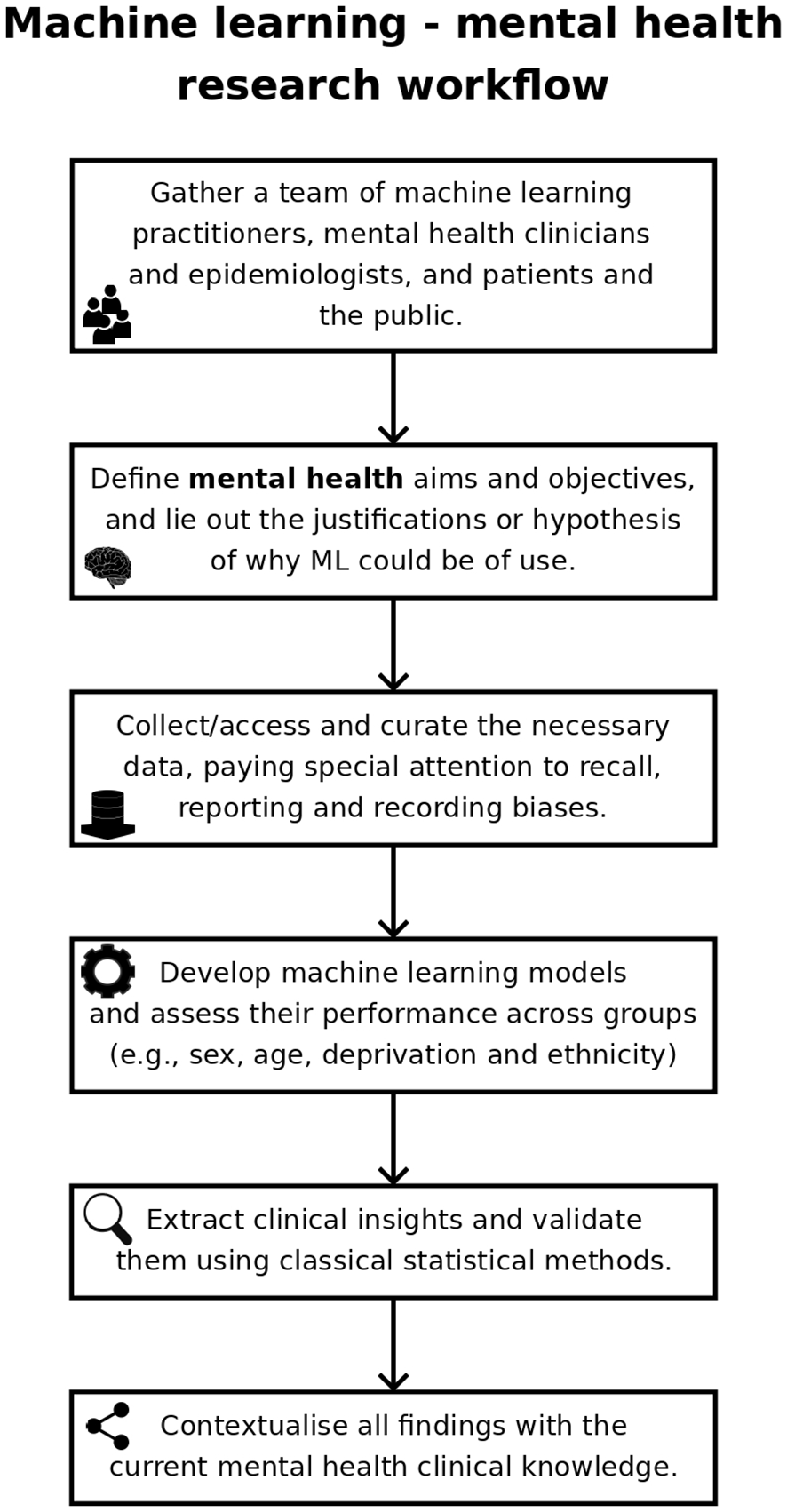Mental health has been a target for ML, with the number of ML mental health publications increasing dramatically since, 2017 (Figure 1), and the research community is rightly expectant of its impact. However, the challenges are amplified: (1) losing sight of mental health objectives, over-promising on data processing and problem-solving (9); (2) technical hurdles of multiple underlying biases and often heightened privacy requirements (11); and (3) difficulties building, validating and approving ML-enabled clinical devices for diseases with insufficiently clear underlying mechanisms (12). Overall, it is the responsibility of individual researchers and institutions alike to demonstrate the value of ML for mental health. Here, we reflect on these ideas and their corresponding steps within the workflow of ML mental health research (Figure 2), in the hope of bringing awareness to the field and to elicit further conversations.