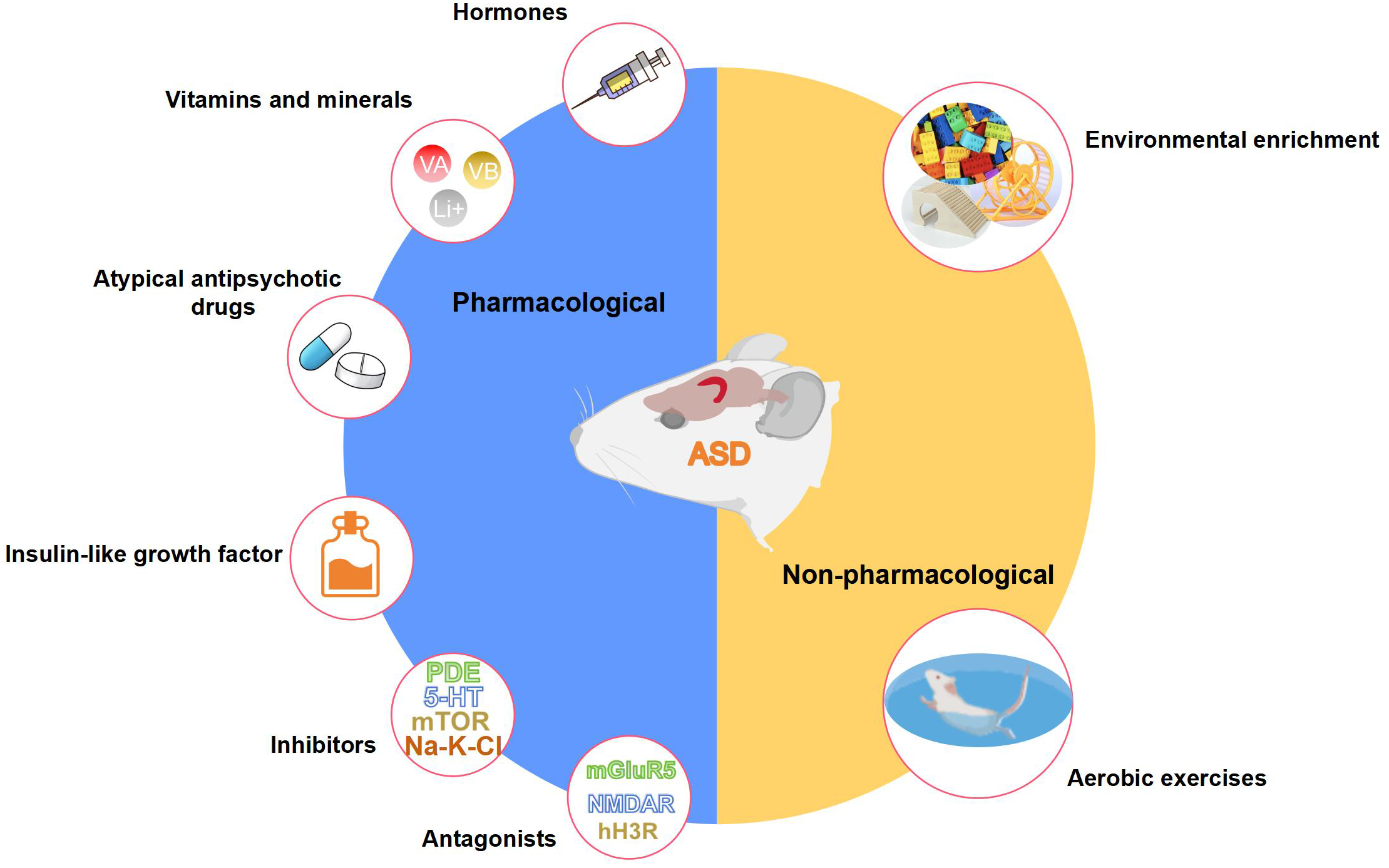 To date, amounts of pharmacological and non-pharmacological interventions that positively impact hippocampus-dependent cognitive functions have been identified through animal experimentation as potential treatments for ASD (Figure 5). Pharmacological interventions mainly include hormones, vitamins and minerals, atypical antipsychotic drugs, phosphodiesterase inhibitors, selective serotonin reuptake inhibitors, mTOR inhibitors, mGluR antagonists, NMDAR antagonists, histamine H3 receptor (H3R) antagonists, and insulin-like growth factor. Non-pharmacological interventions mainly include aerobic exercise and environmental enrichment. Table 1 presents elaborate cellular and molecular modifications in the hippocampus of animal models of ASD following each intervention.