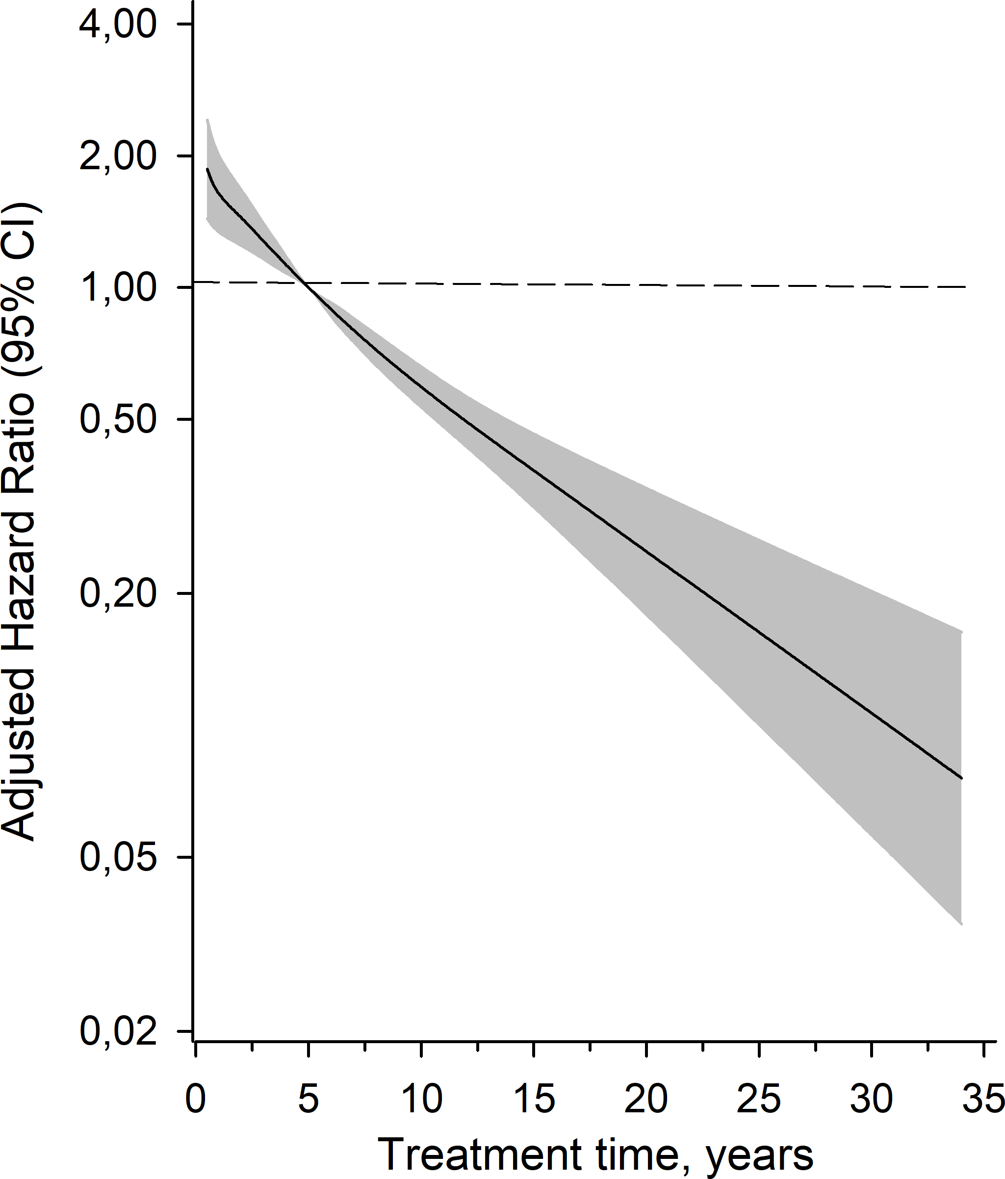 Adjusted hazard ratios for all-cause mortality as a function of the treatment time years calculated model derived from a 3-knot restricted cubic spline Cox proportional hazards regression models. The median time (5 years) was set as the reference. The model was adjusted for age, sex and SUD. Gray area represents the 95% confidence intervals.