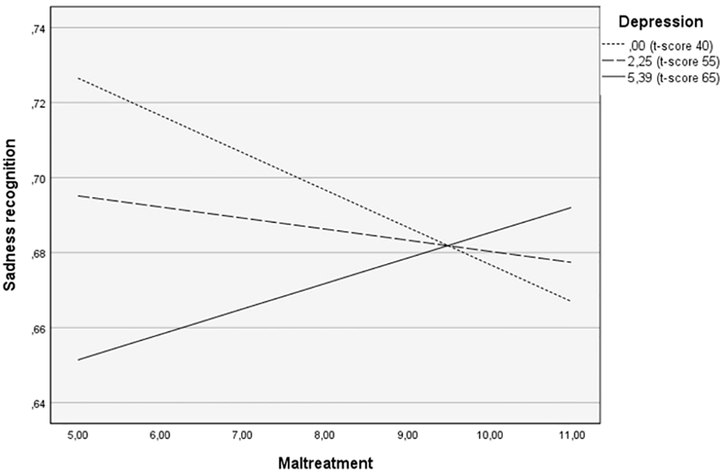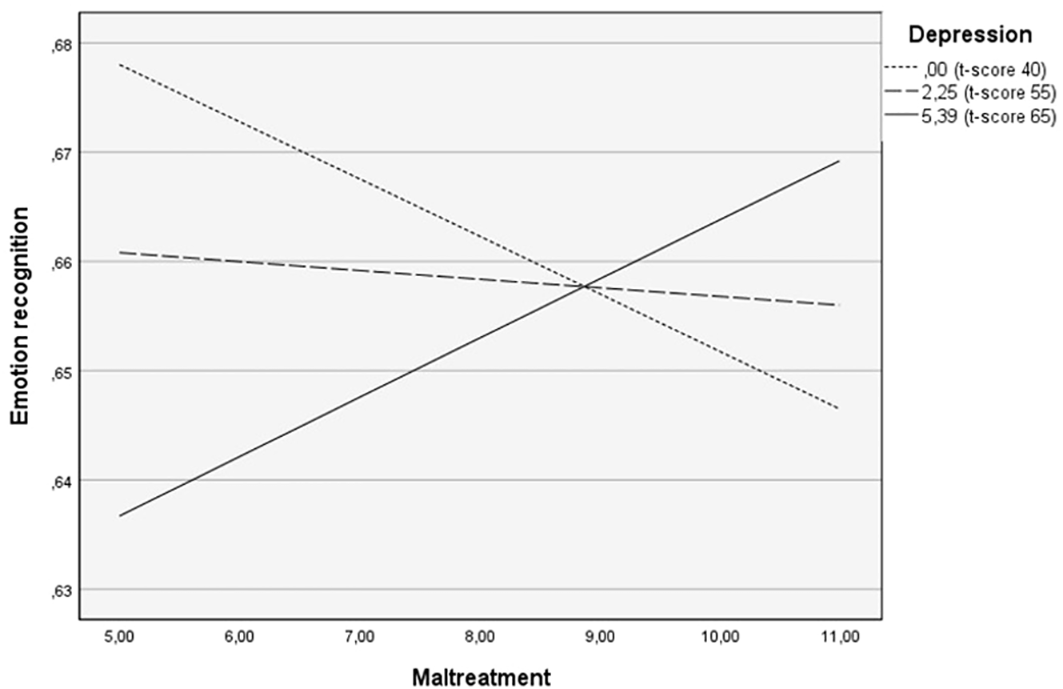 Multiple hierarchical regression analyses were performed to examine the moderating role of depressive symptoms on the relationship between a history of childhood maltreatment and emotion recognition. The model was significant F(5, 46) = 5.65, p < 0.01, with variables accounting for 29,97% of the variance in emotion recognition. The interaction term Maltreatment X depression significantly predicted emotion recognition (b = .002, t(46) = 2.59, p = .01) (Table 3).