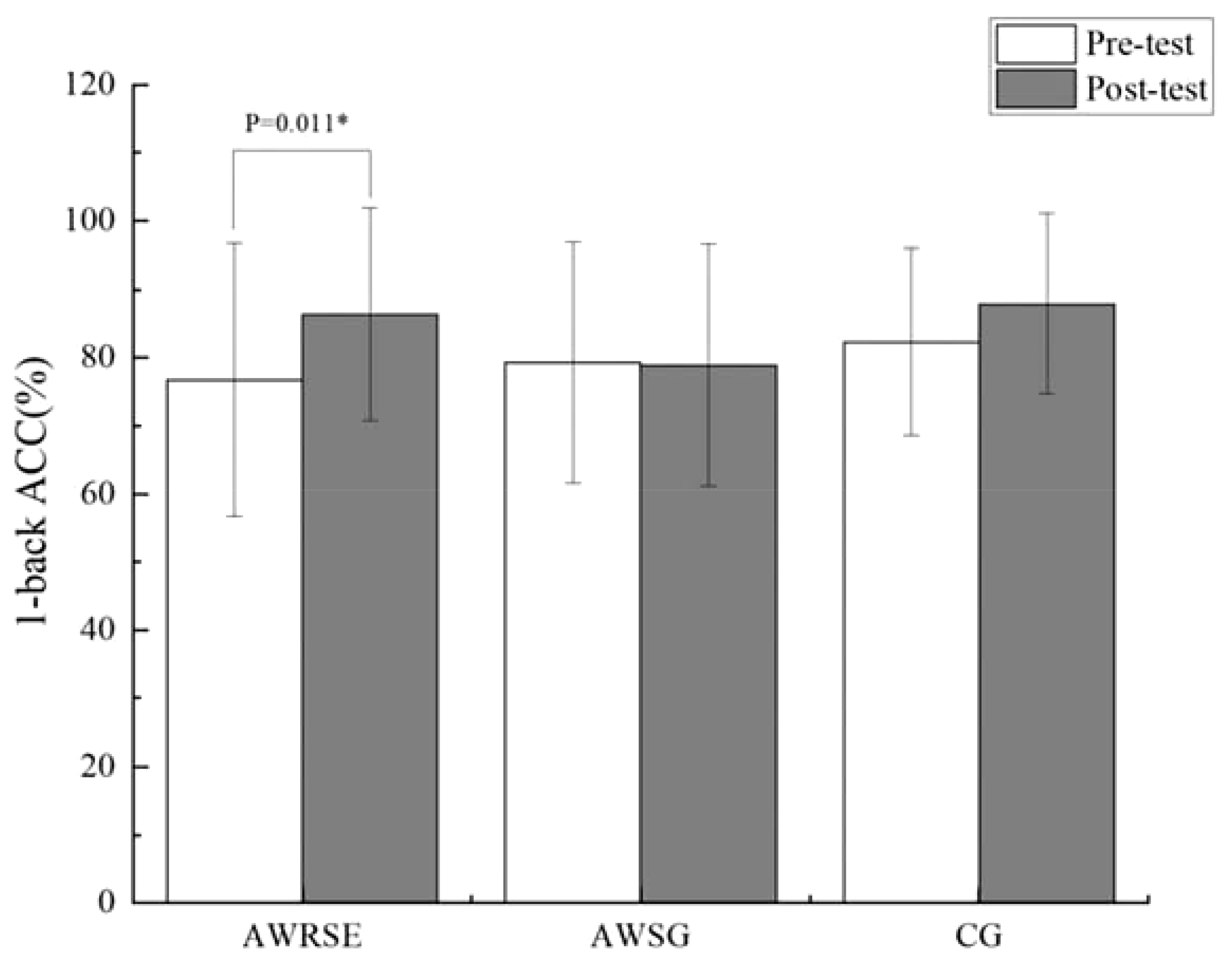 As shown in the results of the paired-samples t-test in Table 5, there was a significant increase in the ACC of the 1-back task for the AWRSE after the intervention compared to before, which was statistically significant (t = -2.793, p = 0.011 < 0.05, Cohen’s d = 0.595) (Figure 2). The CG showed a significant reduction in RT for the 1-back task, which was also statistically significant (t = 2.125, p = 0.050 ≤ 0.05, Cohen’s d = 0.515) (Figure 3). Although there were positive changes of varying degrees in the other indicators for each group, the differences within each group before and after the intervention were not statistically significant (p > 0.05). These results suggest that an 8-week RSE can significantly enhance the WM of children with ADHD, as reflected in the increased ACC of the 1-back task. In contrast, the two groups that received 8 weeks of SG showed only a significant reduction in RT for the CG’s 1-back task, leading to the suspicion that the positive effect may not be due to the SG itself but could be the result of other factors.