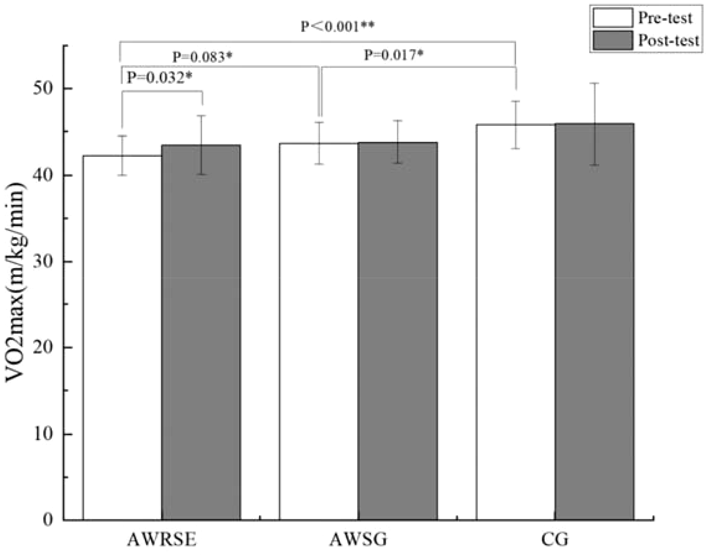 Figure 5 VO2max to assess CRF by group. * p<0.05, representative p values have significant differences, ** p<0.01, represents p values with extremely significant differences.