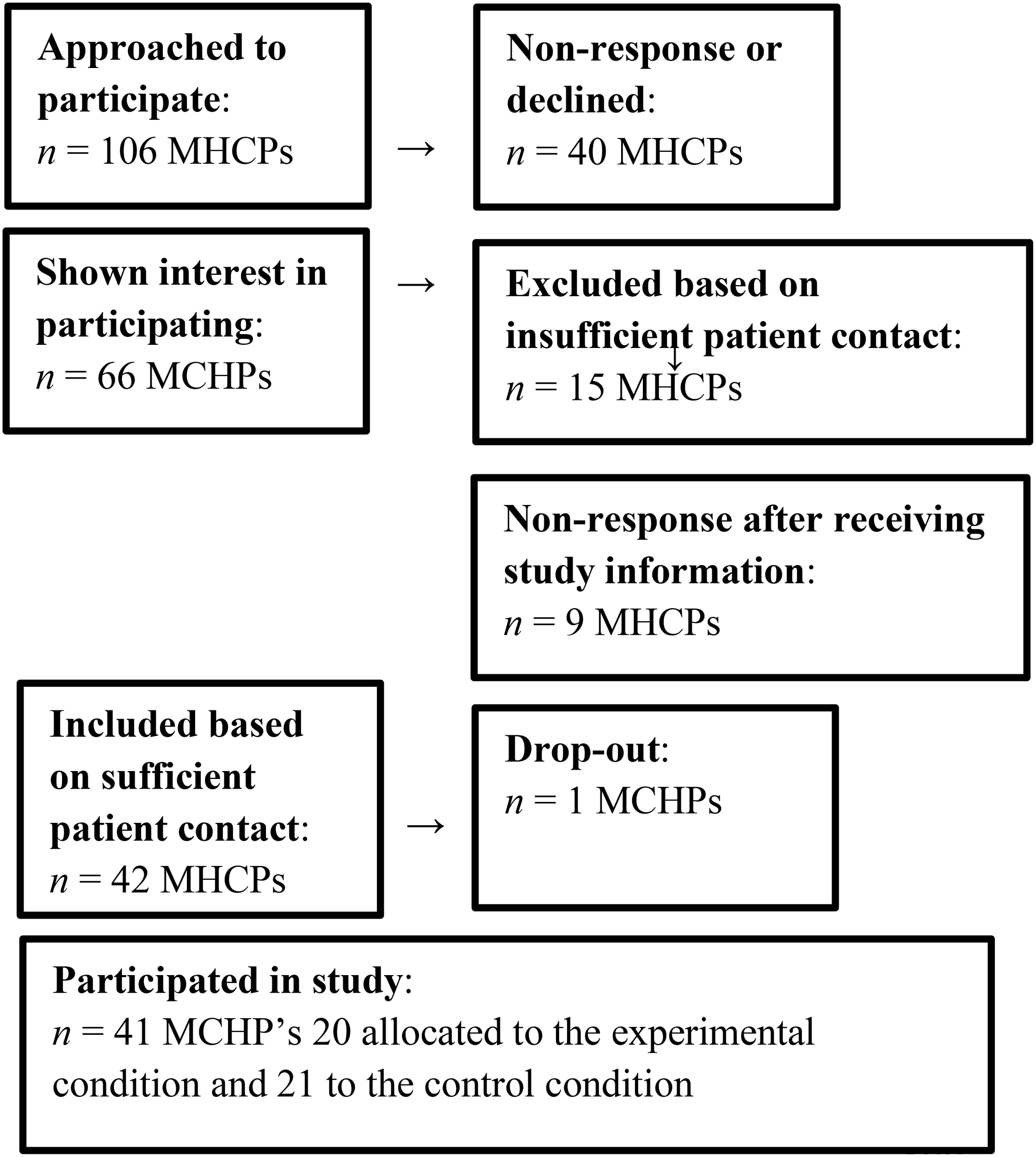 A total of 106 MHCPs from the mental health organization Arkin - Mentrum Amsterdam in the Netherlands were randomly selected out of a list of employees (Figure 1: Flowchart MHCPs). MHCPs worked at different departments and teams for treatment of patients with severe mental illness (SMI) at clinics or outreaching teams; e.g. (Functional) Assertive Community Treatment teams. They were invited to participate in the study and informed via email which contained an informed consent form and a demographic questionnaire. The aim was to obtain a diverse sample (social psychiatric nurses, psychiatrists, psychologists, case managers and job coaches all working at teams for treatment of people with severe psychiatric disorders). 42 out of the 106 MHCPs met the inclusion criteria and agreed to participate, one dropped out at the beginning of the study due to work appointments. The inclusion criterion for the MHCP was that during the study they would be able to arrange face to face contact with the participating patient weekly. For MHCP characteristics see Table 1. The number of participants needed for the study was determined by means of G*power analysis for which an alpha level of.05 and a power of.80 were used (42). Considering the effects from previous research, a medium effect size of.25 was expected, resulting in 28 participants for testing a time*condition interaction (24, 41).