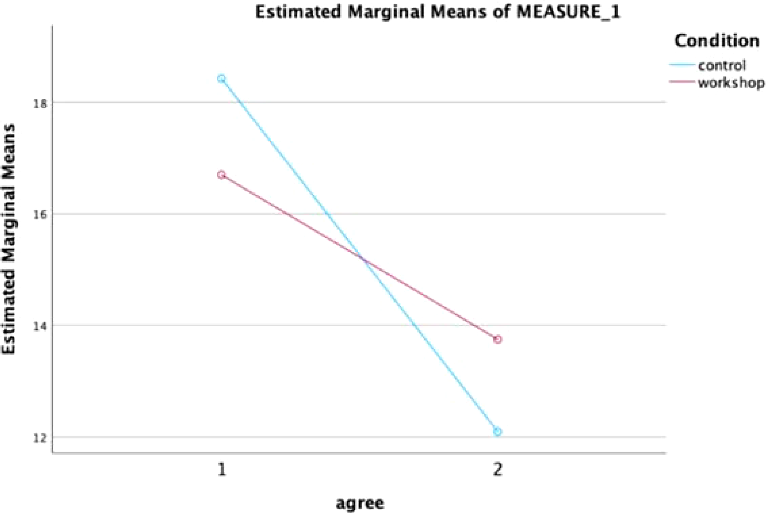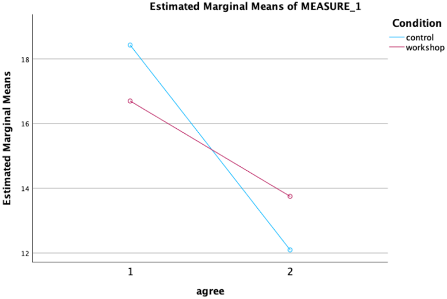 For the subscale Agreement, a significant effect of time was found (Figure 3), F(1,39) = 9.86, p <.01 ηp2 = .87, meaning that over time Agreement scores decreased in both conditions. No significant effect of condition was found for Agreement, F(1,39) = .00, p = .98, and no significant interaction effect was found, F(1,39) = 1.31, p =.26. suggesting that the ACT-training had no effect on the ‘Agreement ‘ subscale, compared to the control condition.