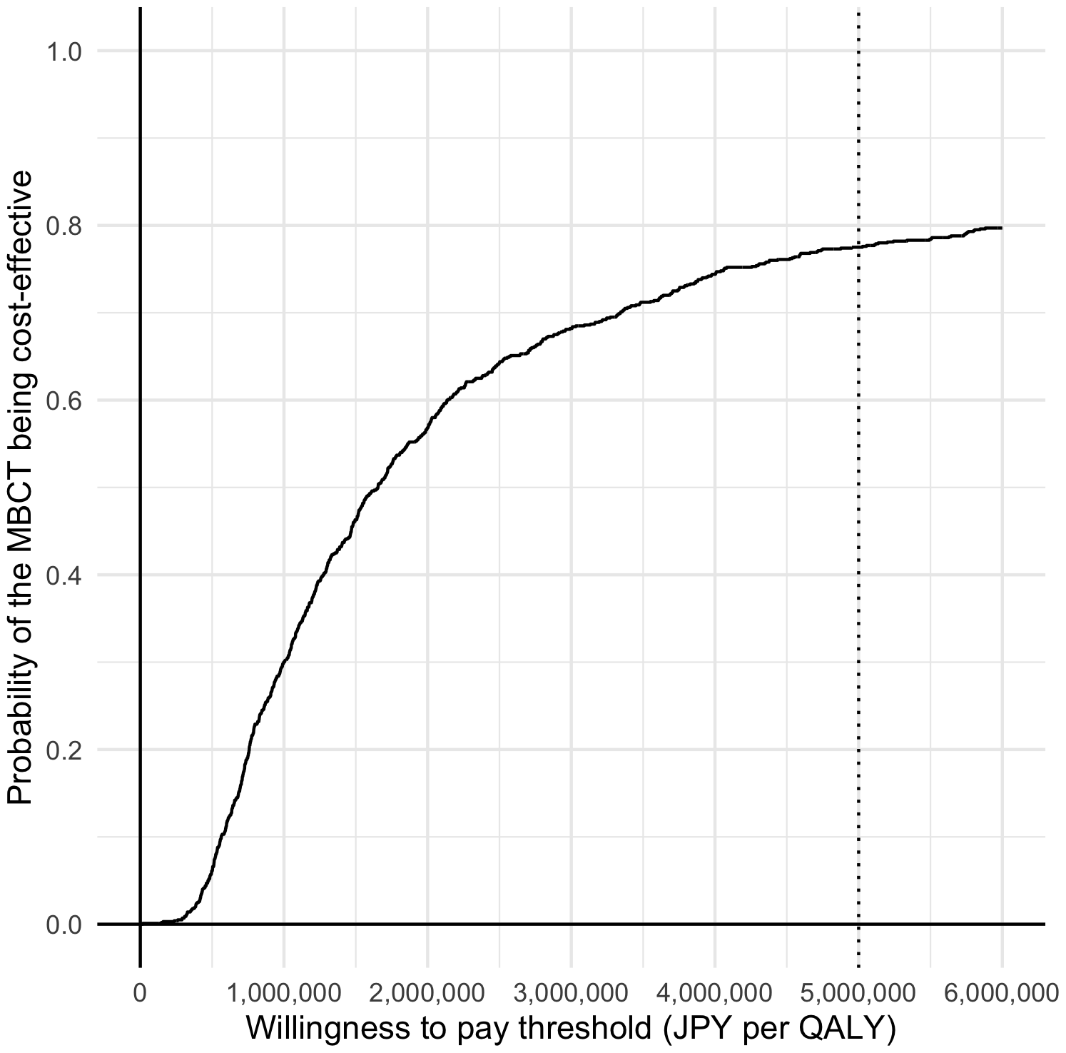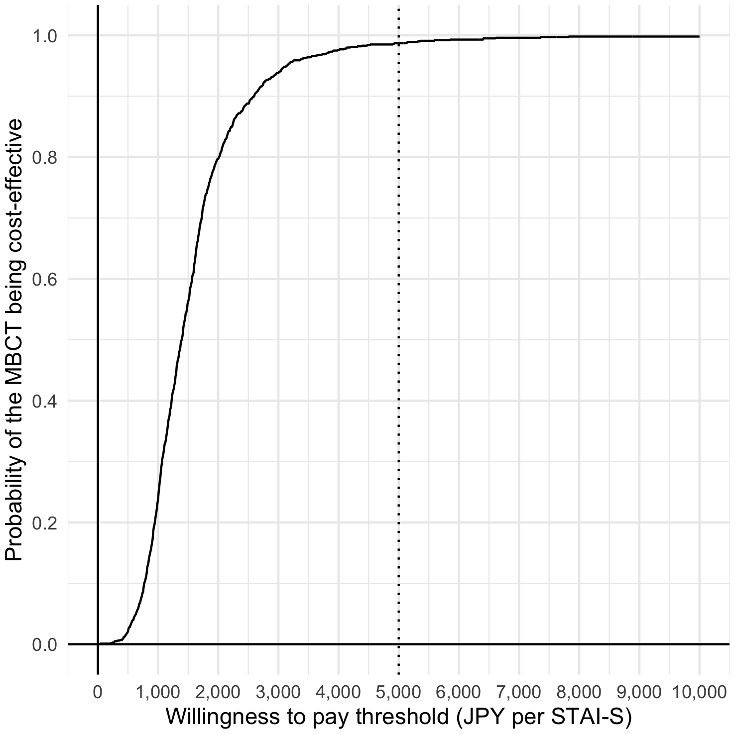 Similar to other typical cost-effectiveness analyses alongside clinical trials, the cost-effectiveness was assessed using complete samples because the QALYs required health-related utility scores at all observational points. The ICER was used to compare the augmented MBCT’s cost-effectiveness (MBCT plus TAU) with that of TAU alone. The ICER was estimated as the result of 1,000 resamplings from the original samples using the non-parametric bootstrap method. Uncertainty was assessed by drawing probabilistic acceptability curves for clinical and political decision-making. The acceptability curves represent the probability that the enhanced augmented MBCT is more cost-effective than TAU alone over a range of hypothetical values placed on the incremental outcome (willingness to pay [WTP] by the decision-makers of the healthcare system). The net monetary benefit approach was used to draw the cost-effectiveness acceptability curves. The net monetary benefit is defined as follows: