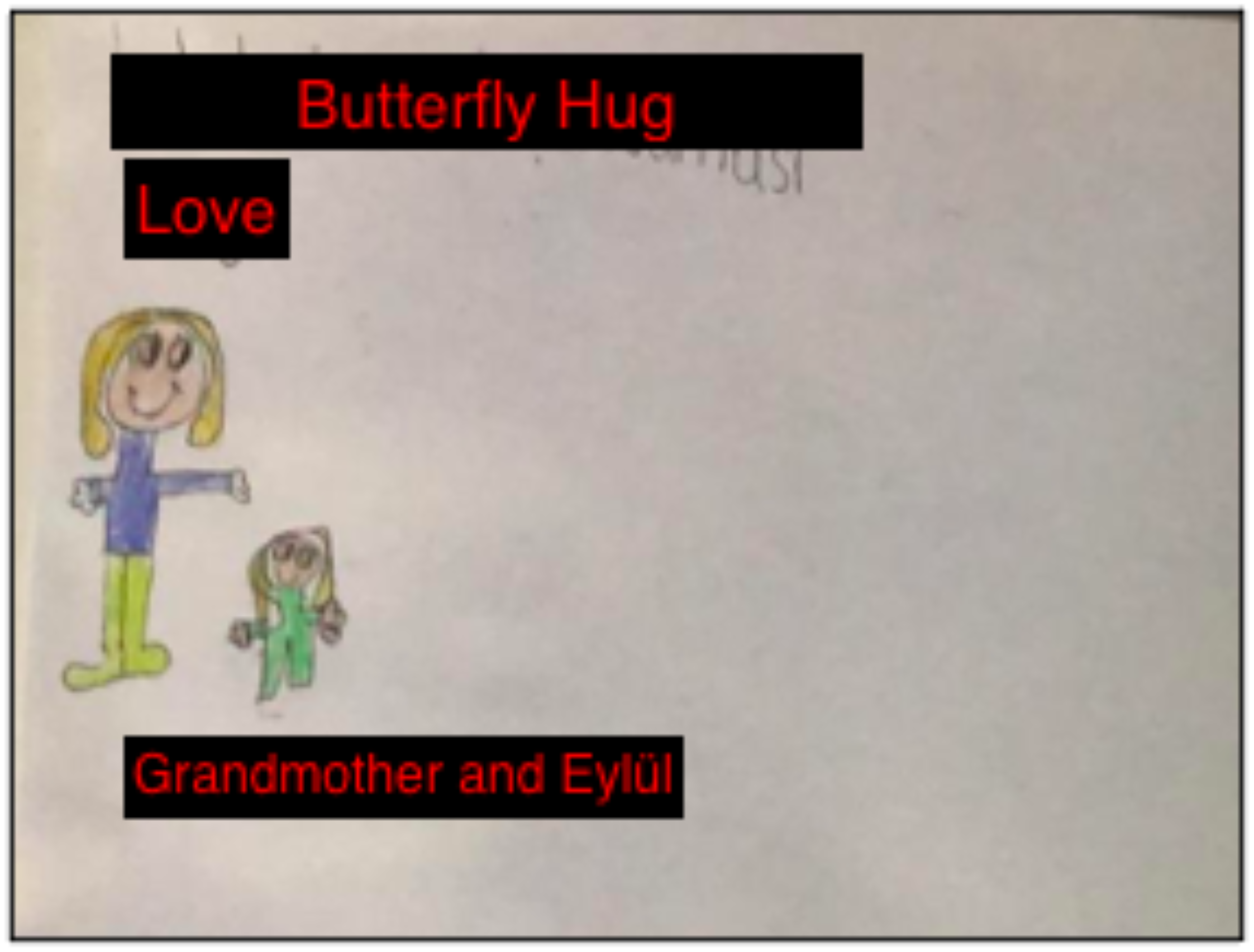 Mother: She wrote a few things, she wrote a butterfly hug, she wrote love. Now she’s drawing something. On the top, it reads butterfly hug. It reads love at the bottom.