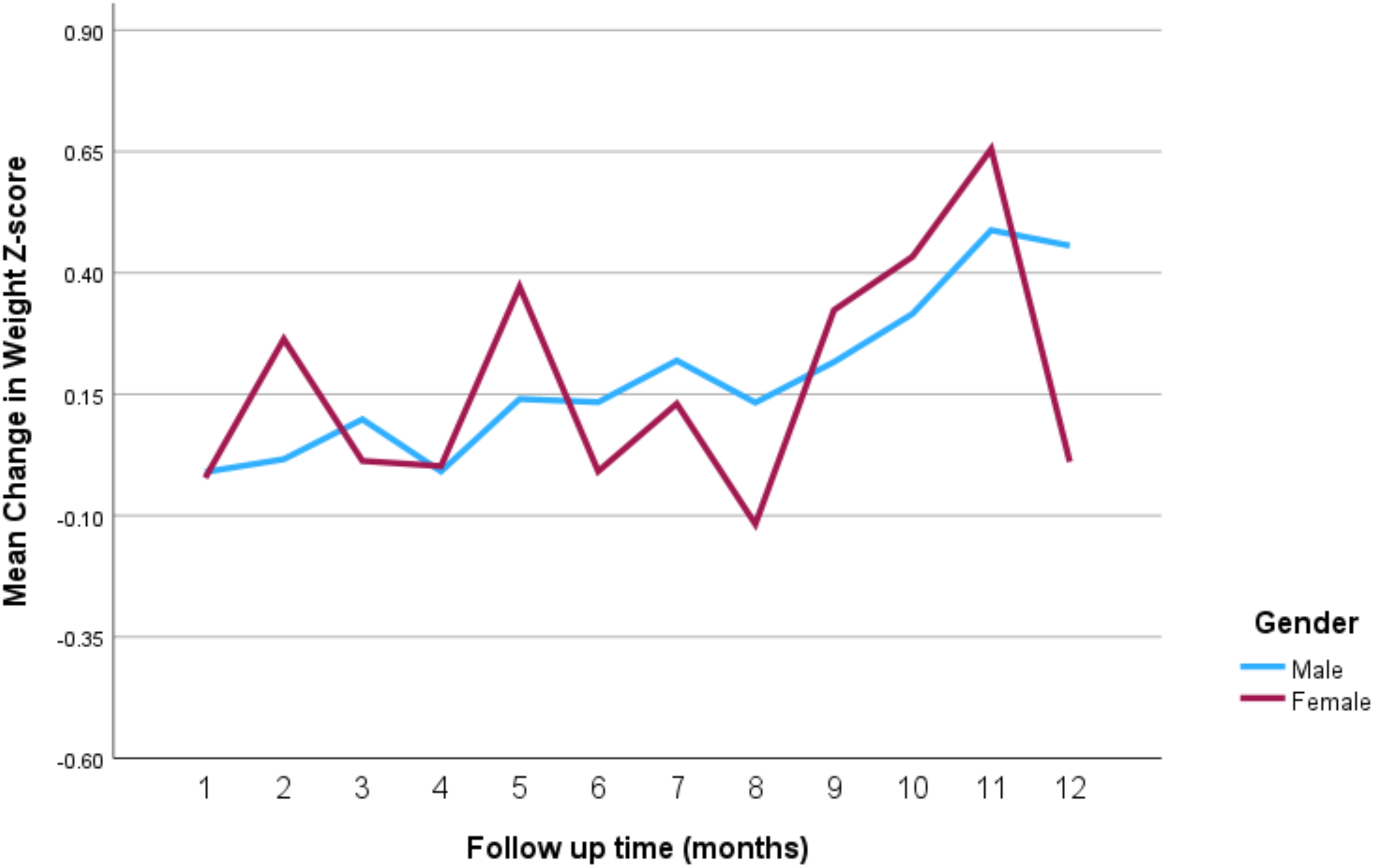 Change in mean weight z-score over time according to gender. Standard errors were not provided as the female gender number are small and therefore the error bars are very high.