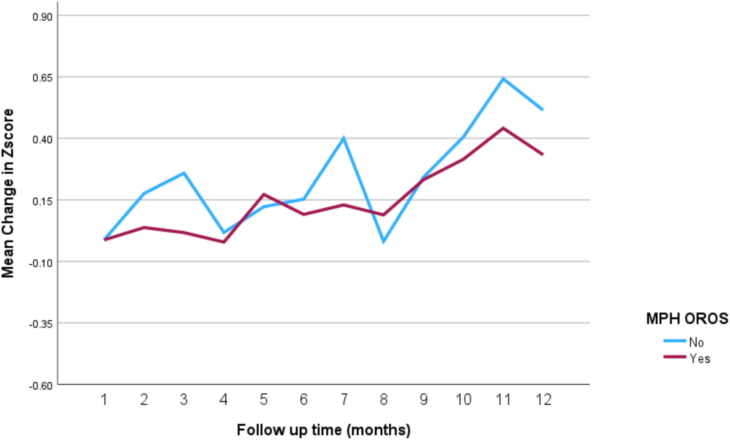 Impact of methylphenidate osmotic release oral system on weight over a 12-month period. MPH OROS, methylphenidate osmotic release oral system.