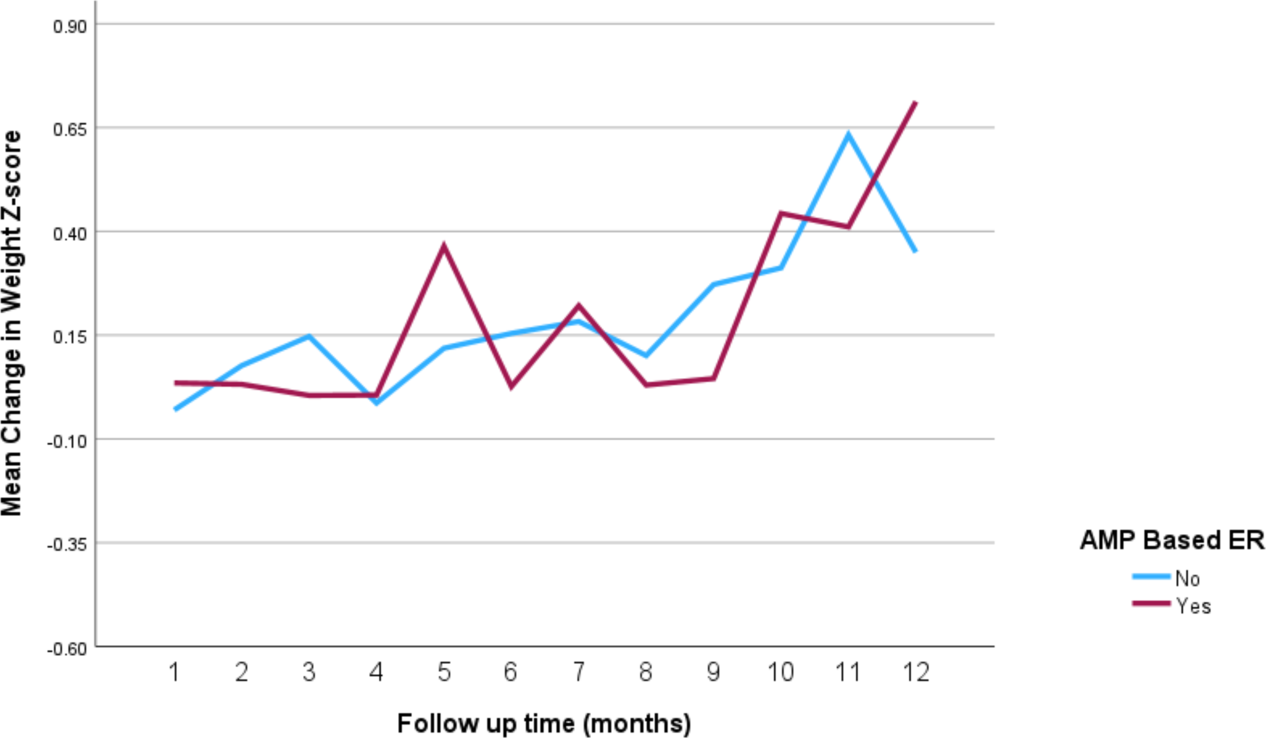 Impact of amphetamine-based extended release (Lisdexamfetamine or amphetamine mixed salts extended release) on weight over a 12-month period. AMP-based ER, amphetamine-based extended release (lisdexamfetamine or amphetamine mixed salts extended release).