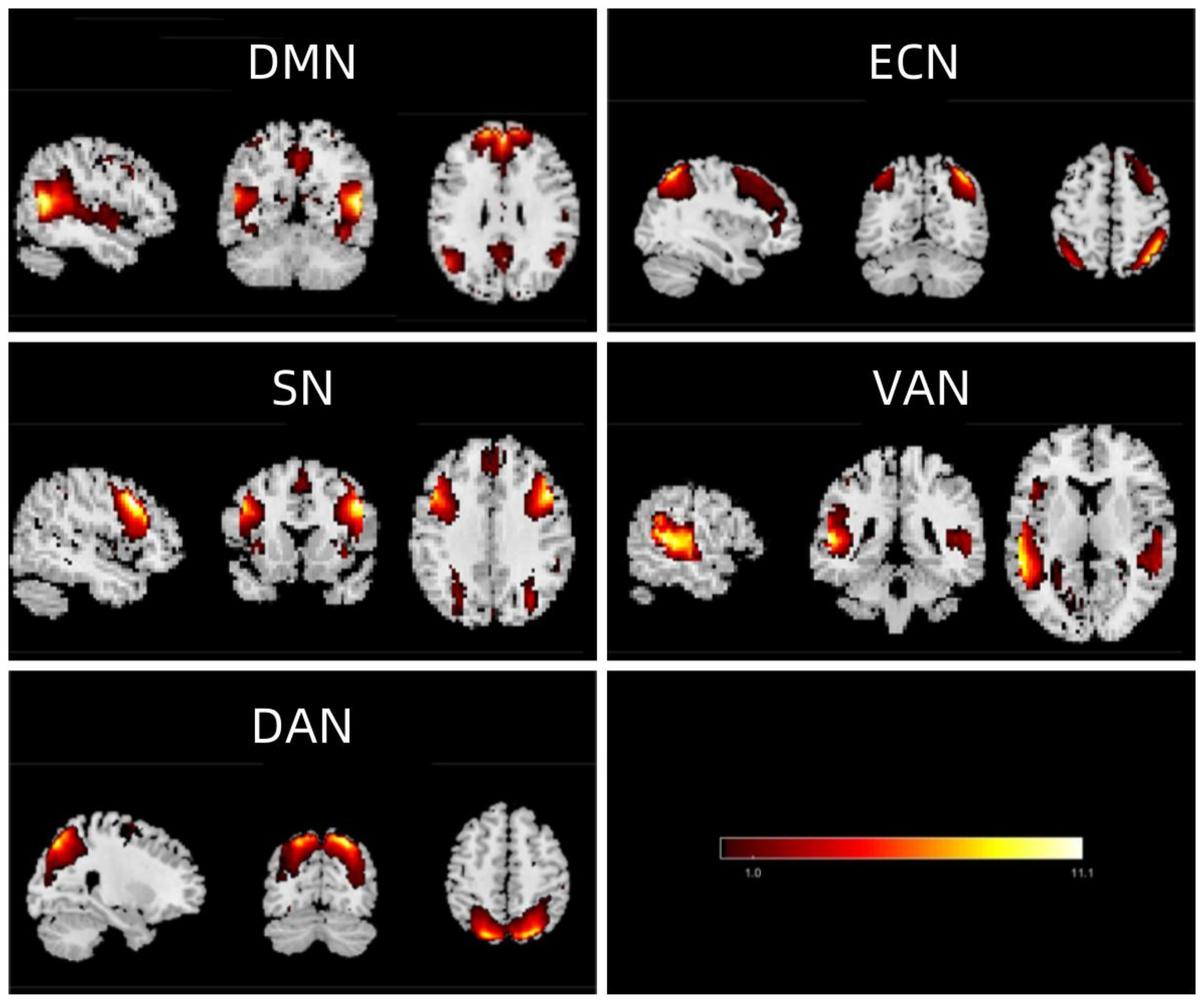 Extracted independent components. From the group ICA of resting-state data, five independent components were identified and classified as follows: DMN (default mode network), ECN (executive control network), SN (salience network), VAN (ventral attention network), and DAN (dorsal attention network).