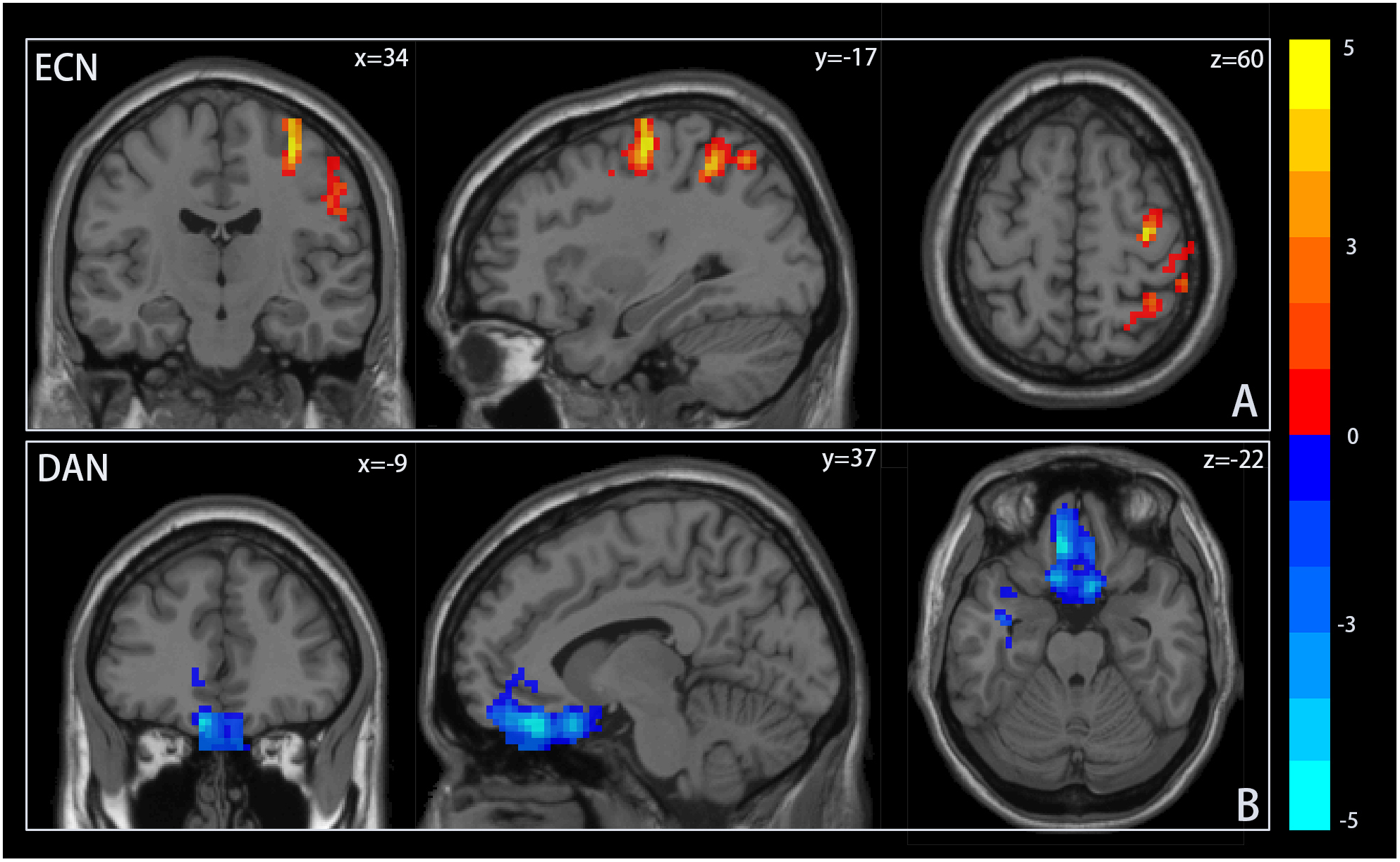 P<0.05, FDR correction, clump ≥ 30, MNI, Montreal Institute of Neurology; ECN, executive control network; DAN, dorsal attention network.
