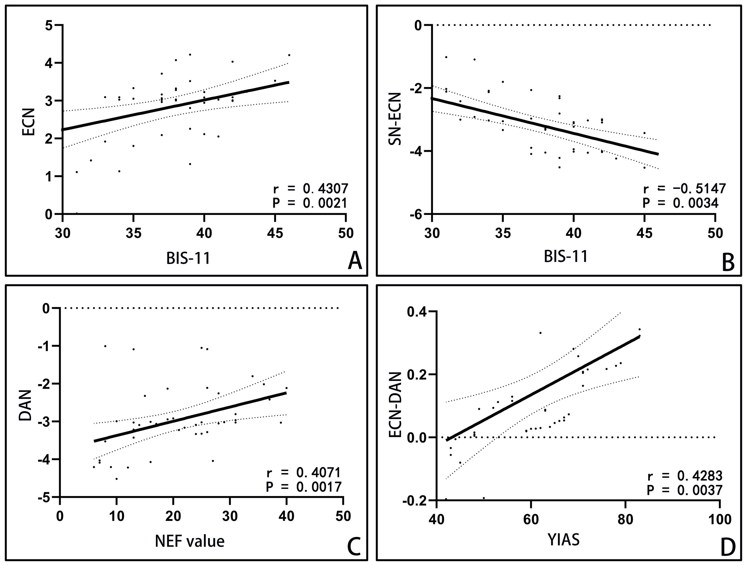 Correlation analysis in IGD group. Notes: (A) Abnormal resting-state activity of ECN was positively correlated with BIS-11 score. (B) Abnormal functional connections of SN-ECN were correlated with the score of BIS-11. (C) The abnormal resting-state activity of DAN was correlated with NEF value. (D) The abnormal functional connection strength of ECN-DAN was positively correlated with the total score of Young scale. ECN: executive control network; BIS-11: Barratt Impulse Scale 11 Chinese Revised Edition; SN: salience network; DAN, dorsal attention network; NEF, number of eye fixation.