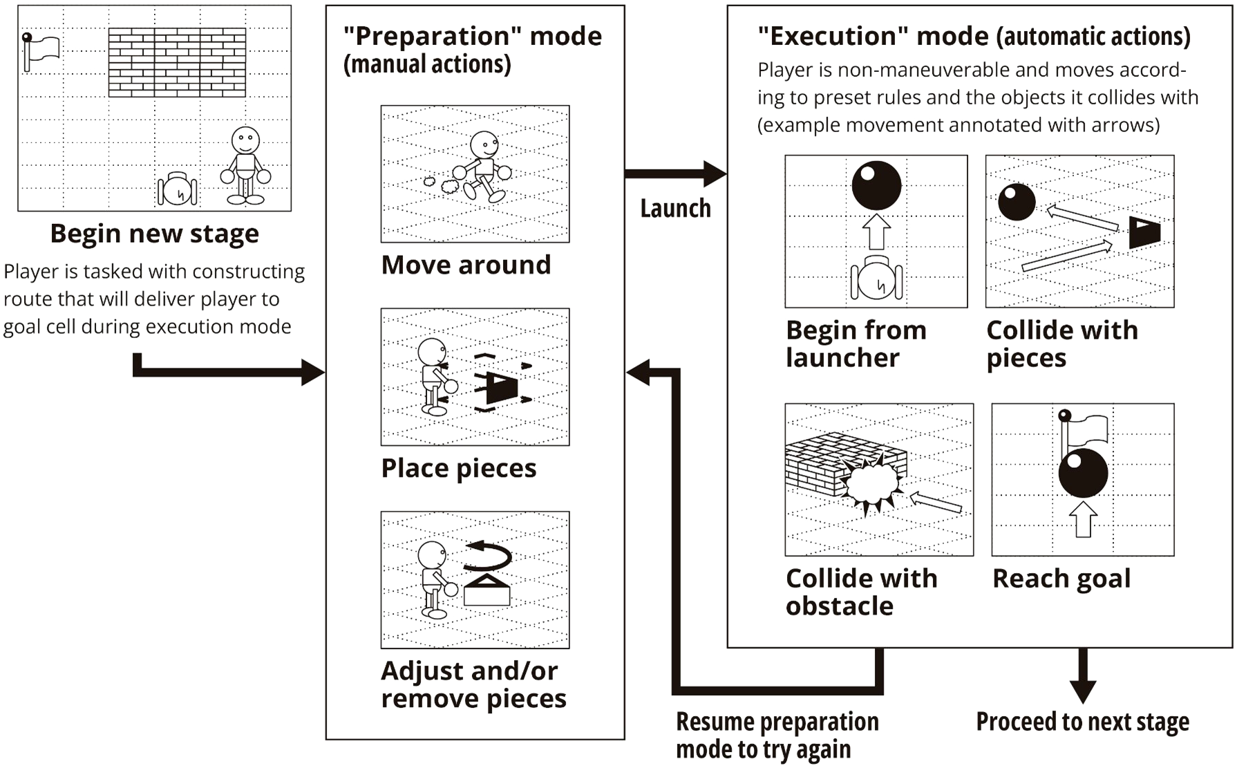 A graphical summary of key actions and events in relation to the manual "preparation" mode and automatic “execution” mode. The player is tasked with placing and adjusting pieces such that the resulting route can deliver an automatically moving player to the goal cell during execution mode.