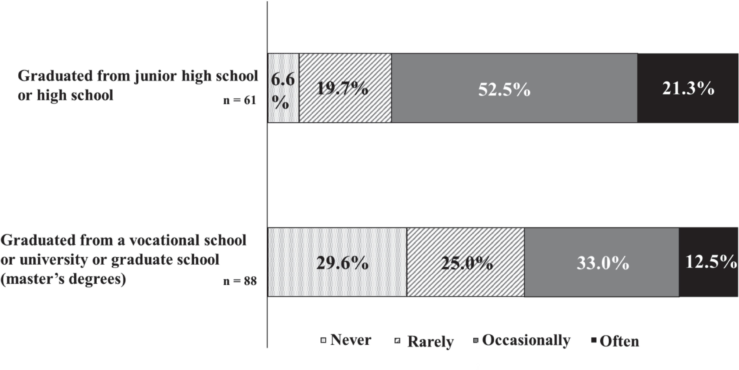Figure 5 reveals that patients with junior high or high school education reported forgetting their medication “often” or “occasionally” more frequently than those with vocational school, university, or graduate school education.