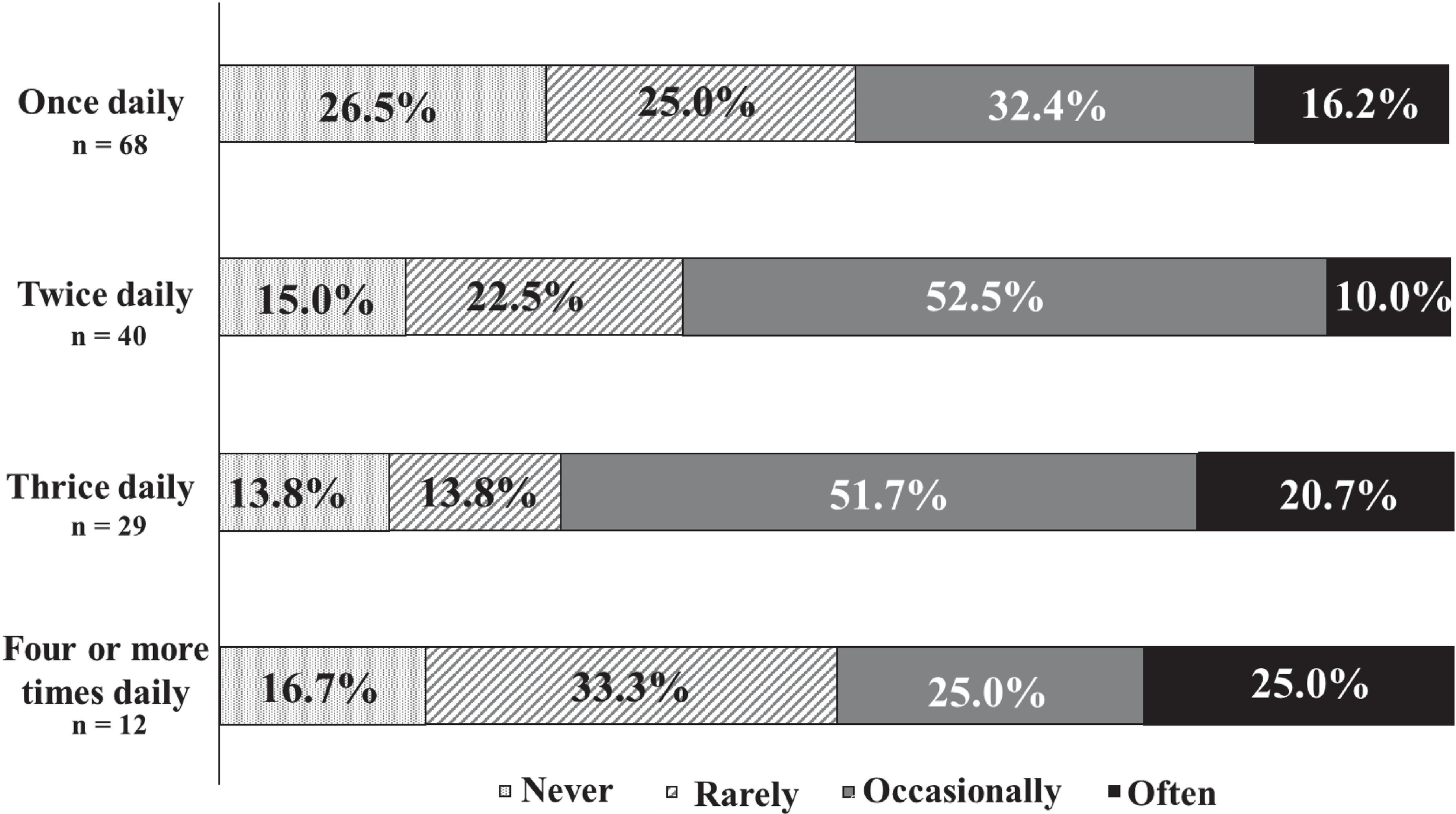 The frequency of missed medication and number of doses. There were 72.4% of patients who took medication three times daily experienced the highest frequency of missed doses.