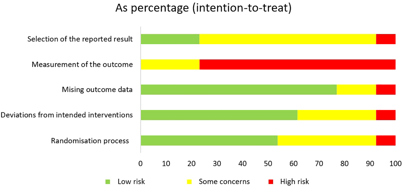 The risk of bias for each study was assessed independently by two reviewers (AS, AM). The tool used was the Cochrane Risk of Bias 2 tool (27), which assesses the following five domains: randomisation process, deviations from the intended interventions, missing outcome data, measurement of the outcome and selection of the reported outcome. Each domain was rated as low risk, some concerns or high risk. No overall risk of bias was calculated. Disagreements in the assessment of risk of bias in individual studies were discussed with a third review author (DA) until consensus was reached.
