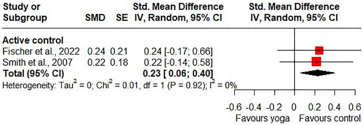 If at least two studies were available for a particular outcome, pooled analyses were performed using R software version 4.3.1 (29) along with the “meta” package (30). For continuous outcomes, standardised mean differences (SMDs) along with 95% confidence intervals (CIs) were computed. This involved determining the difference in means between groups and dividing it by the pooled standard deviation, employing Hedges correction for small study samples. In cases where standard deviations were not directly provided, they were derived from standard errors, confidence intervals, or t-values. Negative SMDs were indicative of favourable effects for the yoga group in terms of stress in comparison to other groups. Conversely, positive SMDs indicated beneficial effects of the yoga intervention on quality of life in contrast to the comparison interventions. When necessary, scores were adjusted by subtracting the mean from the maximum instrument score (31). Random-effects models were employed using the generic inverse variance method. Additionally, the Hartung-Knapp small-sample correction was applied to account for uncertainty in pooling treatment effects from a limited number of heterogeneous studies (32–35). Cohen’s categories were employed to assess the extent of the overall effect size: (1) SMD 0.2 to 0.49: small; (2) SMD 0.5 to 0.8: moderate; and (3) SMD > 0.8: large effect sizes (36).