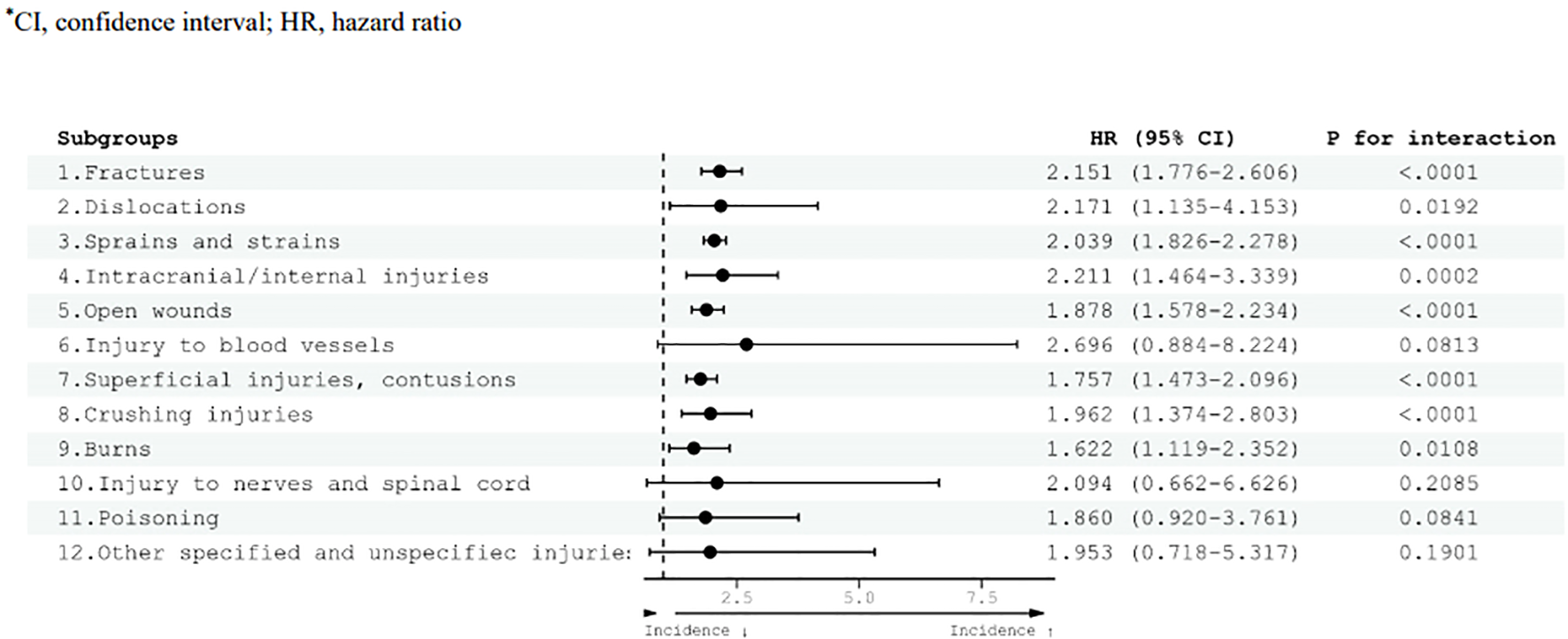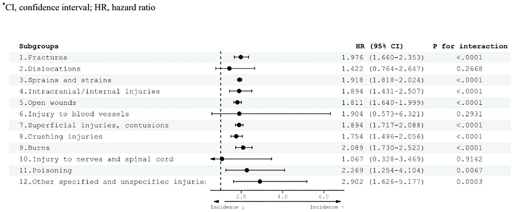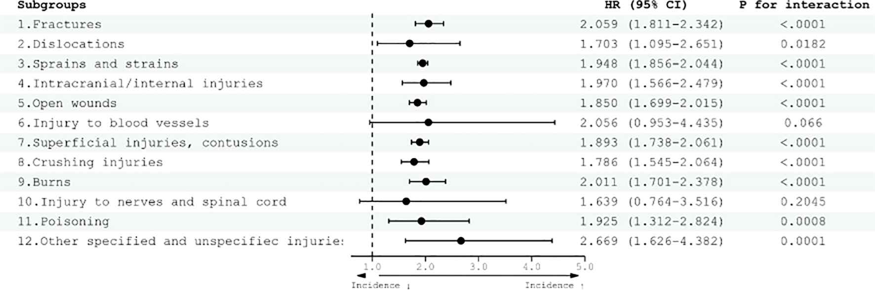 In adults with ADHD, an elevated risk of mild injury was observed compared with the control group (Figure 4). Specifically, the HR for various injury categories were as follows: fractures (HR 1.976, 95% CI 1.660–2.353), sprains and strains (HR 1.918, 95% CI 1.818–2.024), intracranial/internal injuries (HR 1.894, 95% CI 1.431–2.507), open wounds (HR 1.811, 95% CI 1.640–1.999), superficial injuries and contusions (HR 1.894, 95% CI 1.717–2.088), crushing injuries (HR 1.754, 95% CI 1.496–2.056), burns (HR 2.089, 95% CI 1.730–2.522), poisoning (HR 2.269, 95% CI 1.254–4.104), and other specified and unspecified injuries (HR 2.902, 95% CI 1.626–5.177).