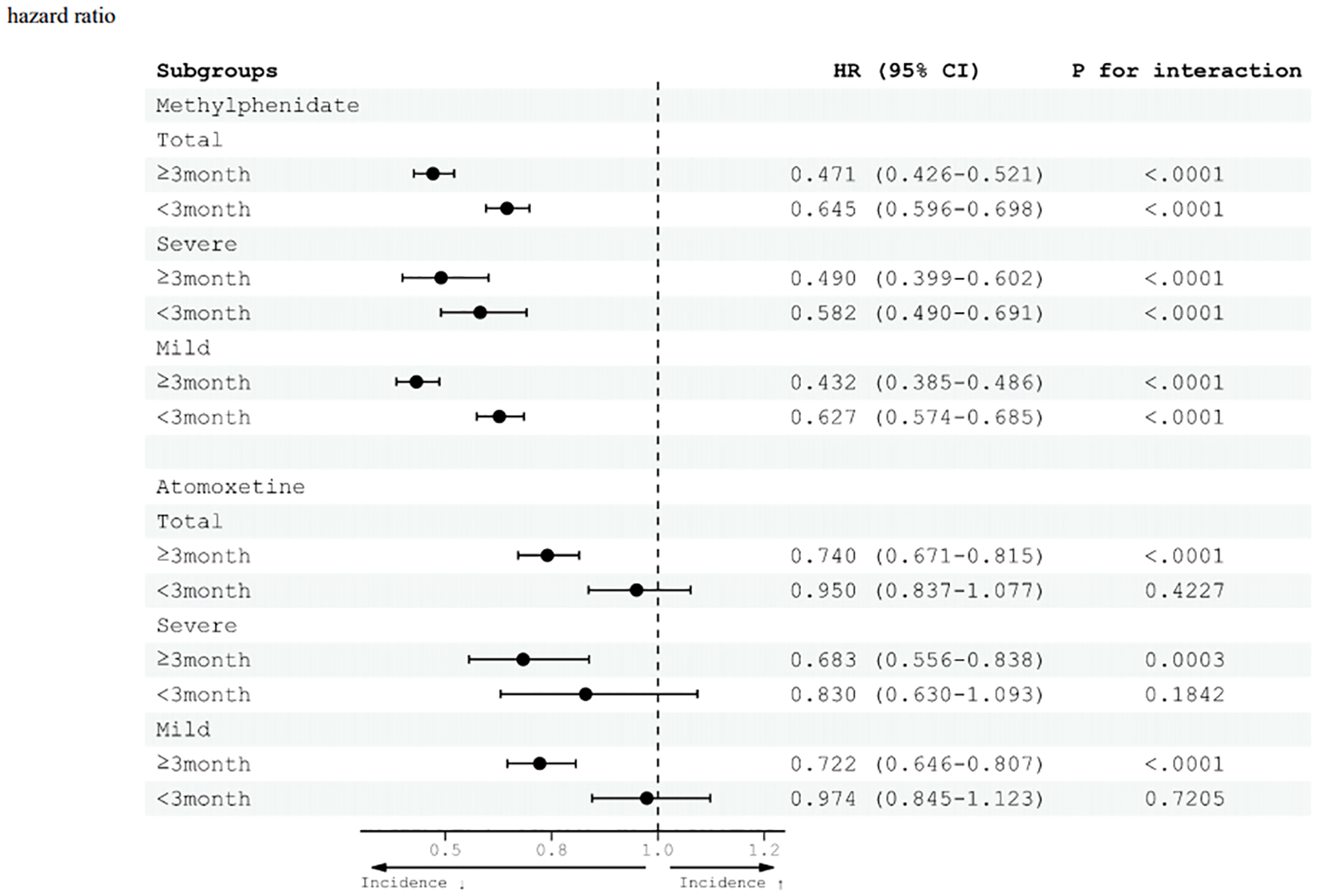 In the atomoxetine treatment group, a decrease in the risk of injury was observed only when the drug was administered for >3 months. In the group receiving atomoxetine for <3 months, there was no significant difference in the risk of injury compared with the group not receiving atomoxetine. Among those who took atomoxetine for ≥3 months, the risk of total injury decreased with an HR of 0.740 (95% CI 0.671–0.815) compared with the group not taking the medication. The risks of severe and mild injuries decreased, with HR values of 0.683 (95% CI 0.556–0.838) and 0.722 (95% CI 0.646–0.807), respectively.