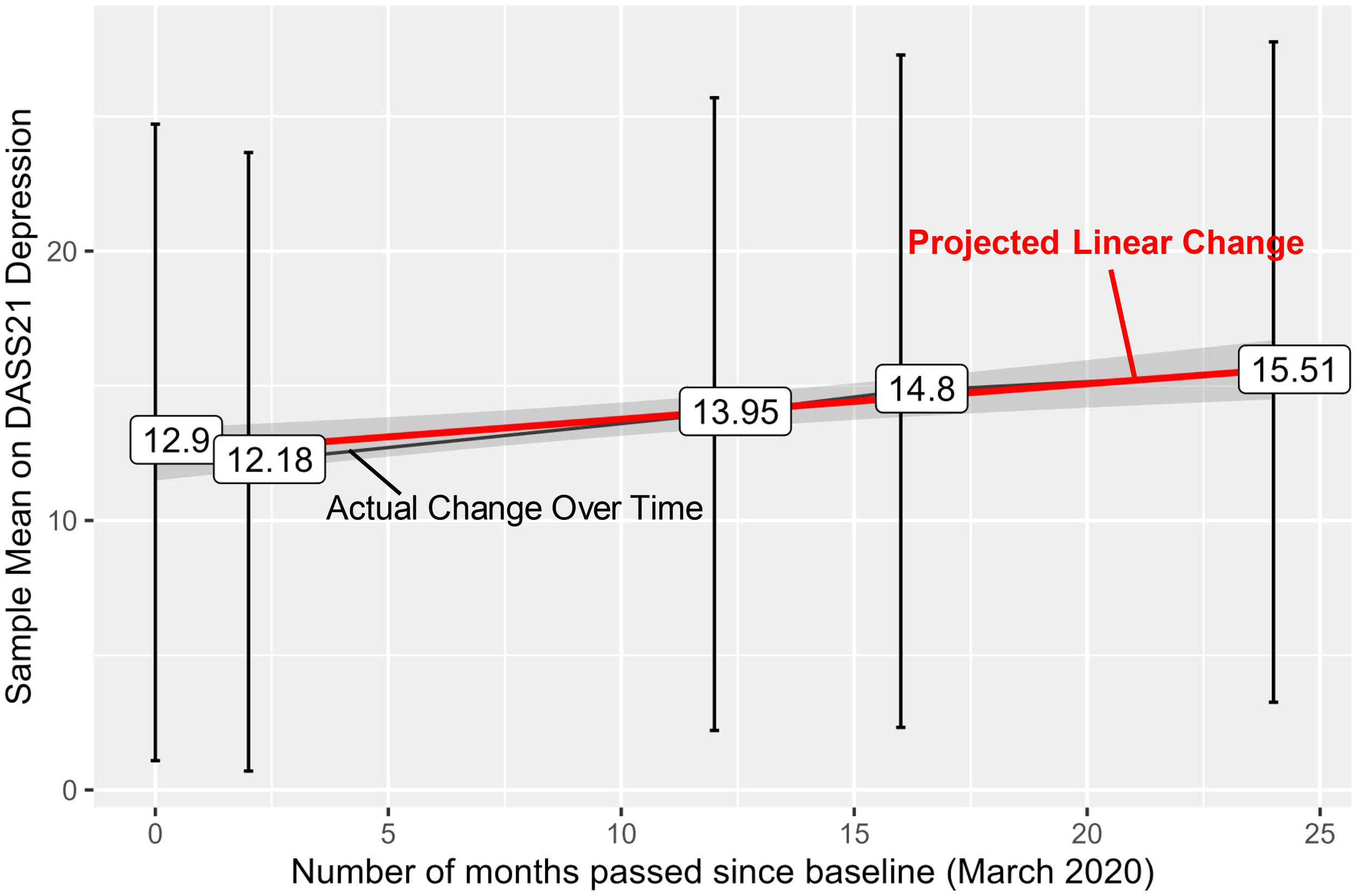 Sample means across timepoint with a linear trend line. The trend line shows that the sample reported an increase over the two years (2.61-point raw increase on average, 20% increase compared to baseline). The black line represents the sample average of self-reported depressive symptoms at each timepoint, with the labels representing the actual means and the whiskers representing ± 1SD. The red line represents projected linear change based on the sample average across the time.