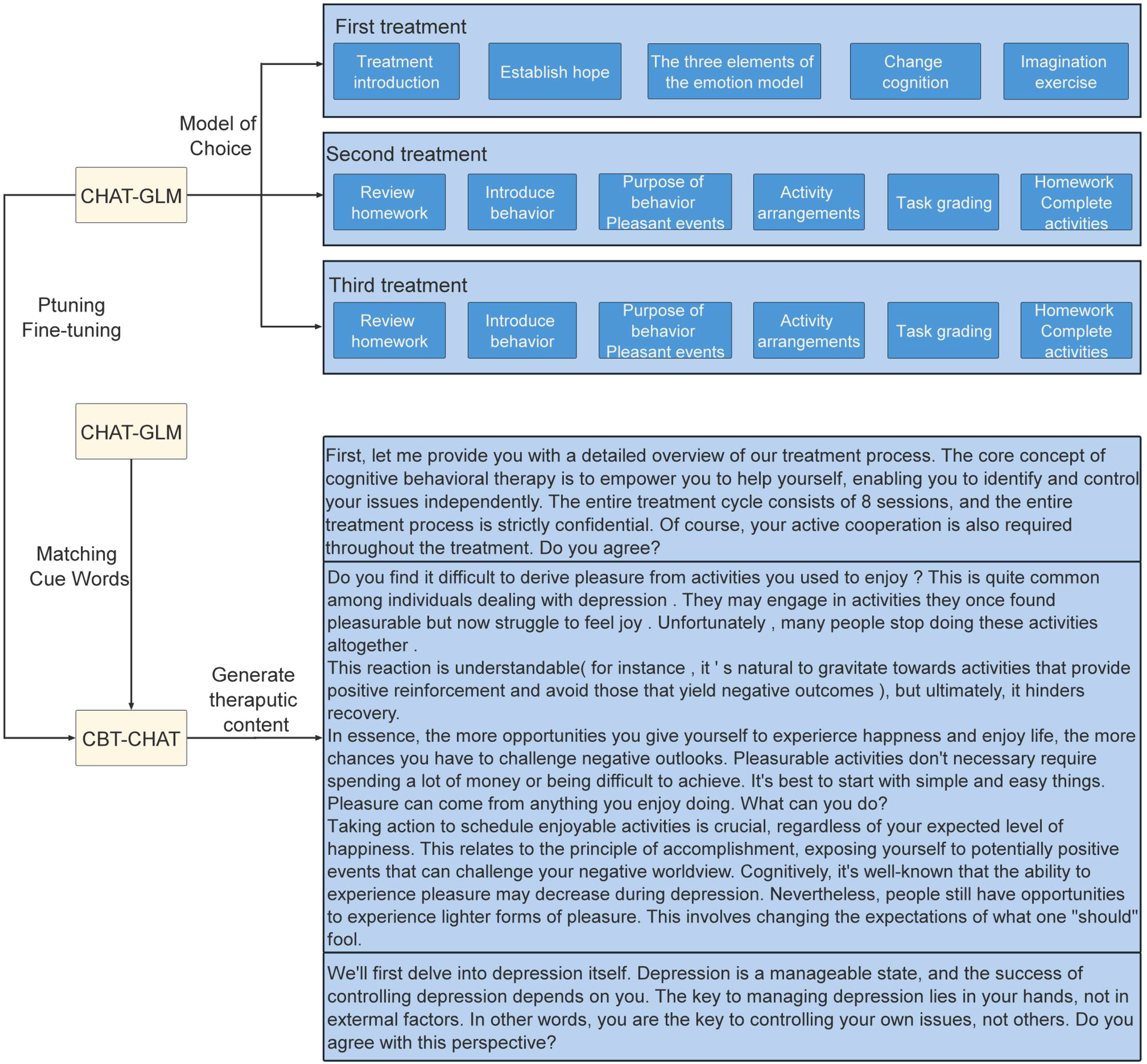 The proposed CBT-CHAT treatment framework enhances CBT by integrating advanced AI technologies. Through CBT-CHAT, patients undergo eight structured CBT treatment sessions. This AI-driven system autonomously generates dialogue content in line with established CBT standards, ensuring consistency and efficacy while significantly reducing clinicians’ time. As the system interacts with more patients, it becomes increasingly effective in managing various mental health conditions.