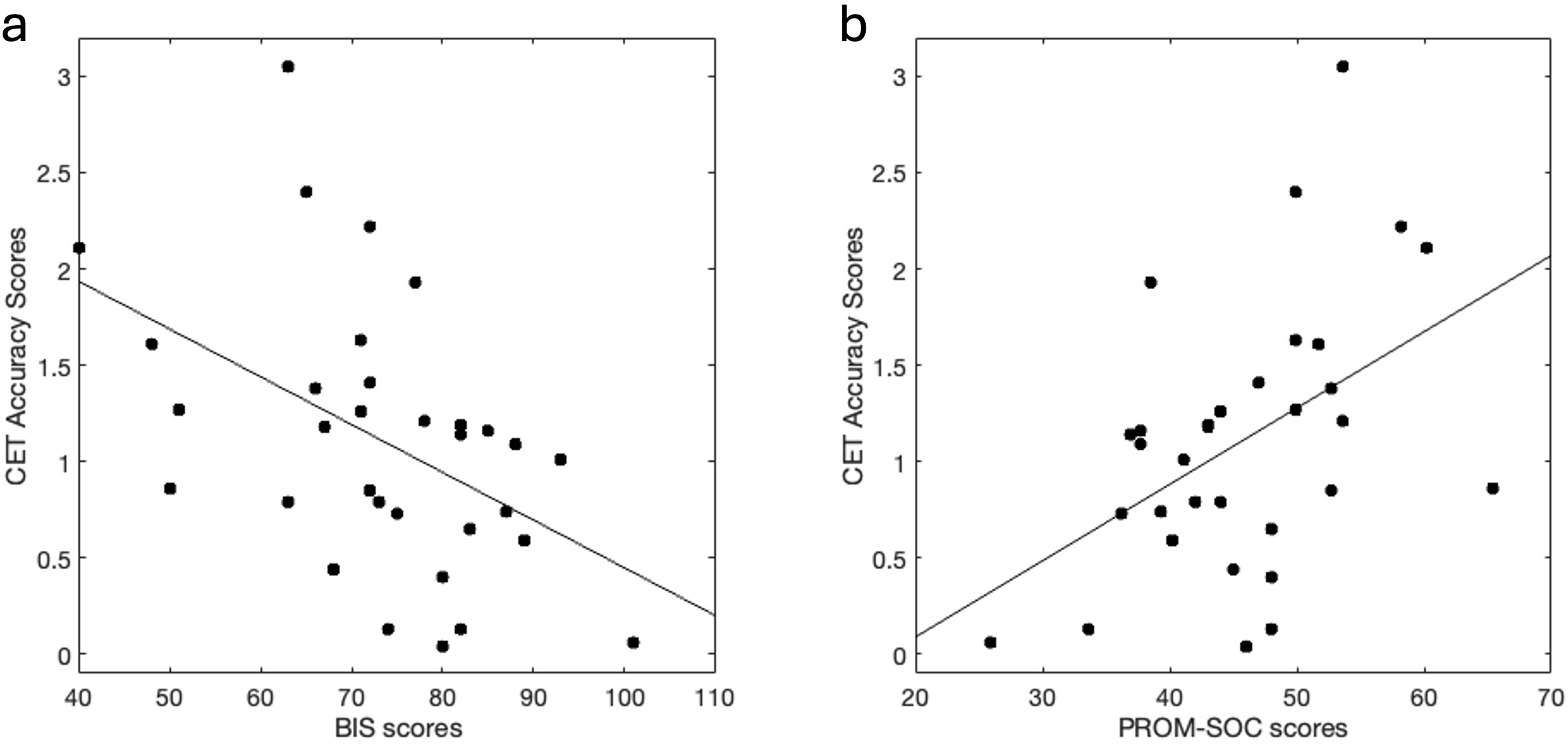 Performance on the CET was inversely correlated with BIS scores (r = -.47, p = 0.006), in that lower performance was associated with more impulsiveness (Figure 2A). Correlations were conducted to explore the relationship of CET performance with BIS subscales (Supplementary Table S2). Performance on CET was positively correlated with PROM-SOC scores (r = .46, p = 0.007) (Figure 2B), in that better performance was associated with higher social functioning. There were no significant correlations between mental health or behavioral variables with NBT or FMT scores.
