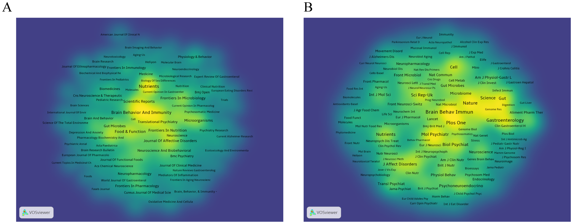 We used VOSviewer software to visualize 188 journals that had published more than two articles on anxiety disorders and gut microbiome research. As shown in Figure 5A, The top five journals were Nutrients, Brain, Behavior, and Immunity (Brain Behav Immun), Frontiers in Psychiatry, Food & Function, and Frontiers in Neuroscience (Table 3). These journals are mainly published in Switzerland, the United States, and the United Kingdom, reflecting a strong focus on this field in developed countries. This indicates that developed countries may be leading in research on gut microbiota and anxiety disorders compared to other countries around the world.