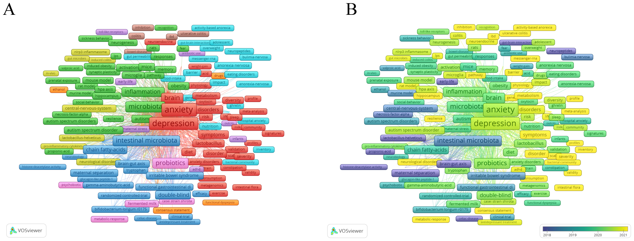 Figure 6. (A) Overlay visualization with relevant keywords anxiety disorder and gut microbiota. (B) Temporal changes in keywords related to anxiety and gut.