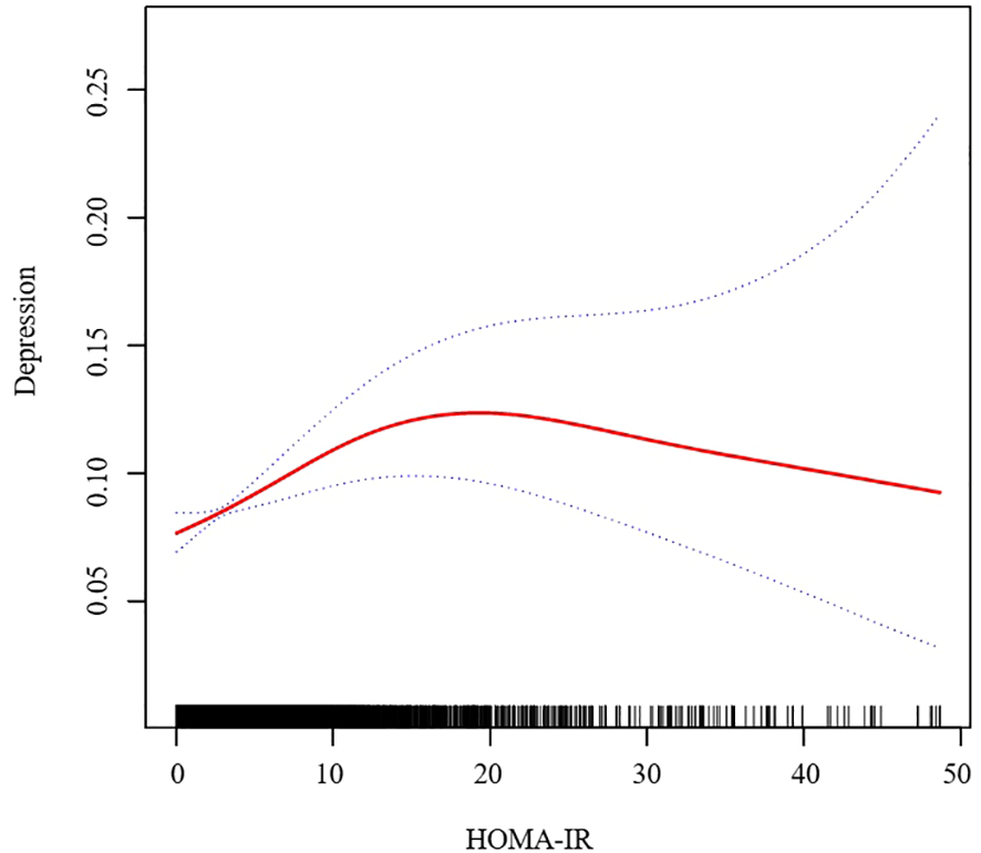 The study included 20,282 participants in the United States. In the regression model adjusted for all confounding variables, the odds ratio (OR) for the correlation between depressive symptom and the Homeostasis Model Assessment of Insulin Resistance (HOMA-IR) was 1.01 (95% CI: 1.00, 1.01). However, a significant discrepancy between trend tests and regression analyses suggests a potential non-linear relationship between depressive symptom and the assessment of insulin resistance using the Homeostasis Model. Constrained cubic spline analysis confirmed this non-linear relationship, identifying an inflection point at 10.47. Before the inflection point, depressive symptom exhibited a significantly positive correlation with the assessment of insulin resistance using the Homeostasis Model. However, after the inflection point, a negative correlation was observed, though it did not reach statistical significance.