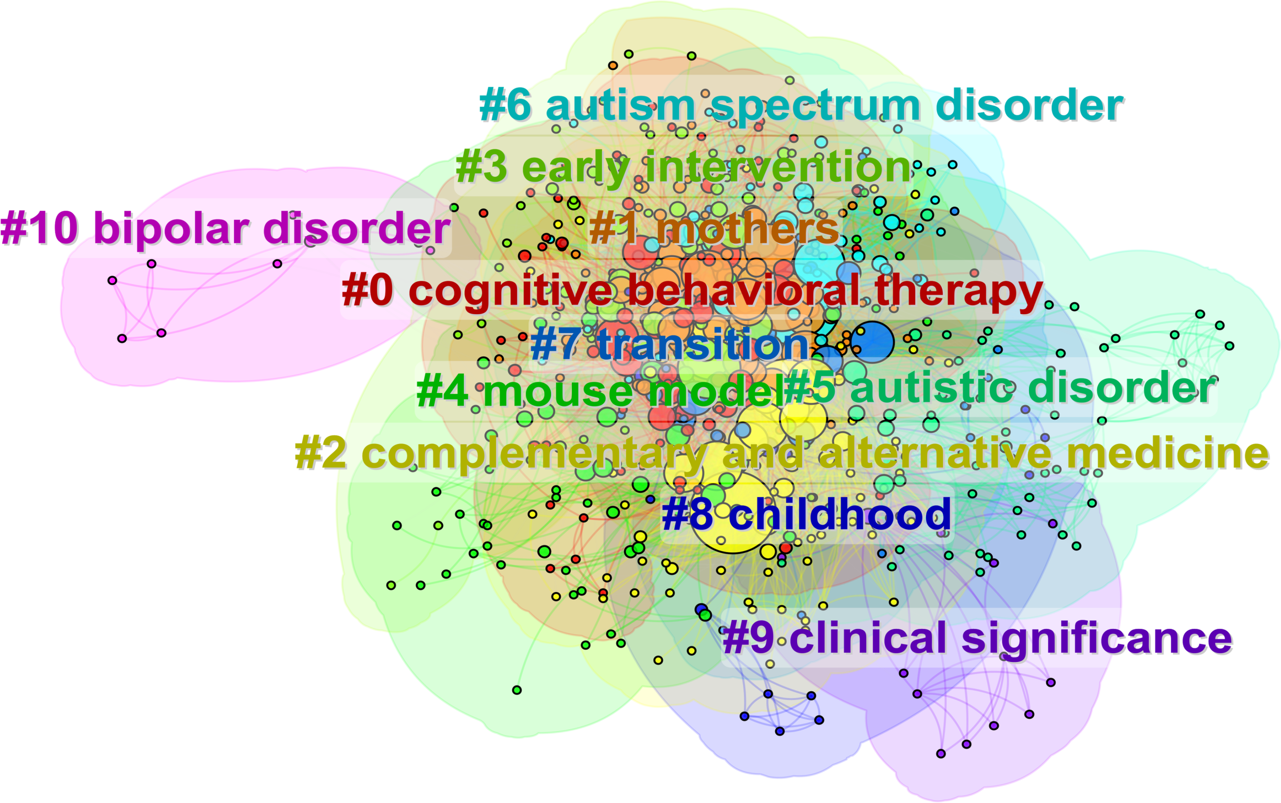Keywords serve as highly condensed representations of scientific research features, reflecting disciplinary hotspots and inter-theme connections. Keywords were extracted using CiteSpace, which also constructed a visual mapping based on keyword co-occurrence relationships. In Figure 8, each node represents a keyword, with node size proportional to keyword frequency. Edges connect related keywords, with line thickness indicating co-occurrence strength. Collectively, the visualization depicts thematic associations and their relative prominence. Notably, Figure 8 reveals two primary research trajectories. The first focuses on early intervention within home environments, including cognitive training, behavioral modification for children/adolescents with autism, and family-centered diagnostic practices. The second trajectory highlights emerging trends in quality of life enhancement for autistic families, communication skill development in children, and vocational rehabilitation programs for adult patients. These findings indicate an evolving research landscape balancing traditional clinical interventions with broader societal support systems.