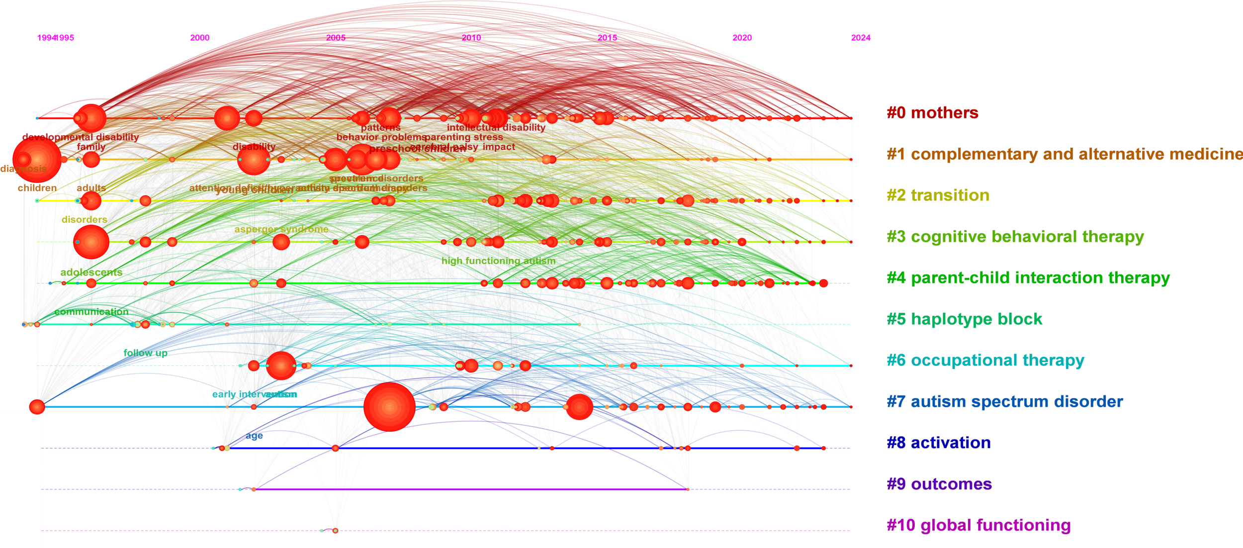In the keyword timeline view, the x-axis is the year in which the keyword appears in the cluster, and the y-axis is the cluster in which each keyword is located, which further shows the occurrence, end, and time trend of each cluster, which can reflect the importance of a specific cluster and the period of its distribution. According to the picture, it can be seen that from 1996 to 2010, autism research focused on children’s communication ability and early intervention; from 2010, the research hotspots gradually shifted to parent training, family therapy system, and parental mental health; from 2020 to 2024, the research hotspots shifted to the importance of family therapy for the autistic family intervention model, the emotional management ability of children with autism, comprehensive family wellbeing index, and caregiver psychology (see Figure 10).