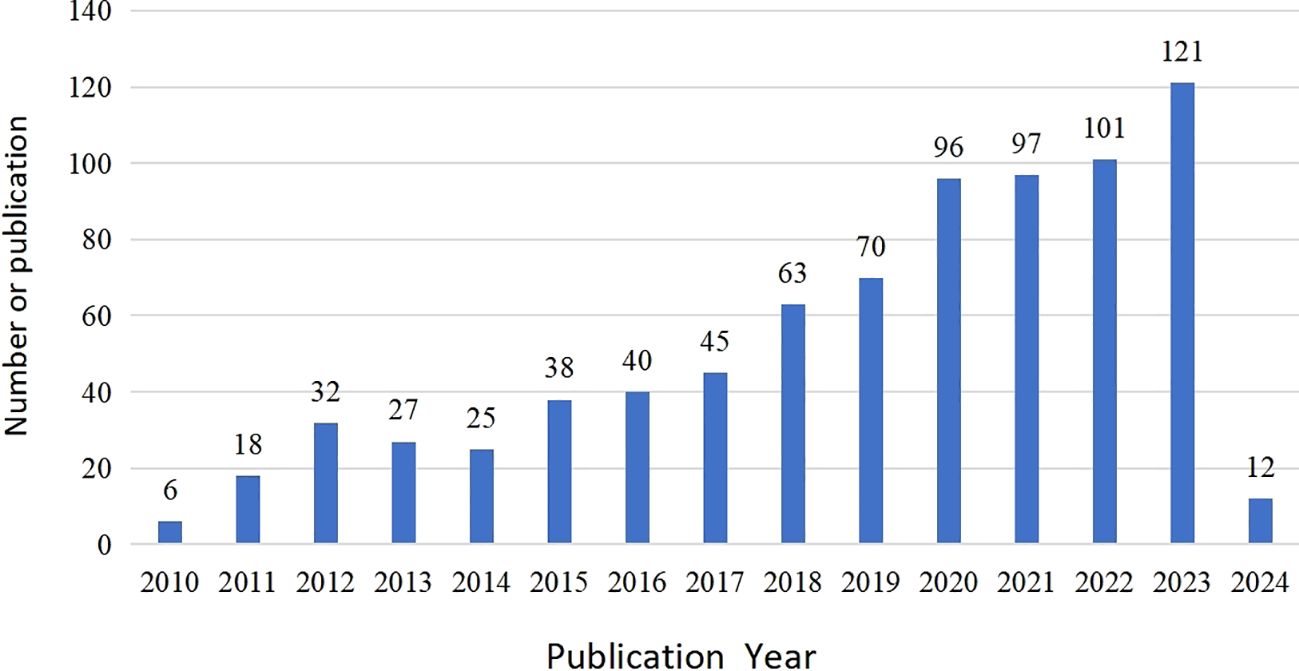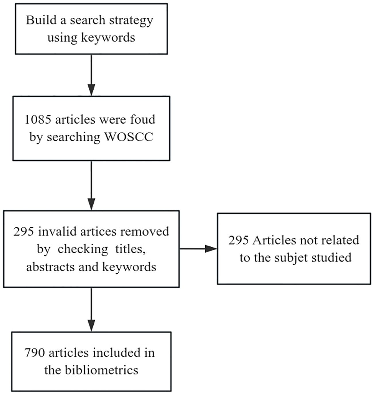 A comprehensive search strategy was employed to identify all literature on ACT for mental disorders listed in the WOSSC database. The literature was retrieved by utilizing the following search terms: Topic=(“Mental Disorder” OR “Psychiatric illness” OR “Mental illness” OR “Anxiety Disorders” OR depression OR insomnia OR somnia OR “Impulse Control Disorders” OR “Dissociative Disorders” OR “Elimination Disorders” OR “Feeding and Eating Disorders” OR “Motor Disorders” OR “Bipolar and Related Disorders” OR “Depressive Disorder” OR “Bipolar Disorder” OR “Motor Disorders” OR “Neurodevelopmental Disorders” OR “Neurocognitive Disorders” OR “Paraphilic Disorders” OR Schizophrenia OR “Personality Disorders” OR “Sexual Dysfunctions” OR “Sleep Wake Disorders” OR “Somatoform Disorders” OR “Substance-Related Disorders” OR “Trauma and Stressor Related Disorders”) AND Topic=(“Acceptance and Commitment therapy” OR “Commitment and acceptance method” OR “commitment acceptance therapy”). In order to ensure that the retrieved data is both in-depth and comprehensive, it is necessary to select the “Topic” field (title, abstract, or keywords). The search period was limited to the interval between 1 January 2010 and 1 March 2024. The publications included were limited to articles and reviews, and the language was restricted to English. In order to ensure that the included literature was relevant to the topic of this study, two researchers independently retrieved data from the WOSCC database and read the titles and abstracts of all the literature separately. A total of 1,085 documents were retrieved based on the aforementioned search criteria. Of these, 295 were excluded from the analysis as they did not align with the study topic. This resulted in the inclusion of 790 documents for analysis, comprising 665 articles and 125 reviews. Upon completion of the literature screening, all literature information was exported to a “plain text” file, and “full record and citation reference” format for subsequent data processing and analysis. The following key information was extracted from the included literature: title, author, year of publication, keywords, journal, institution, country/regions, type of literature, and number of citations. This will provide an important basis for subsequent data analysis and research.