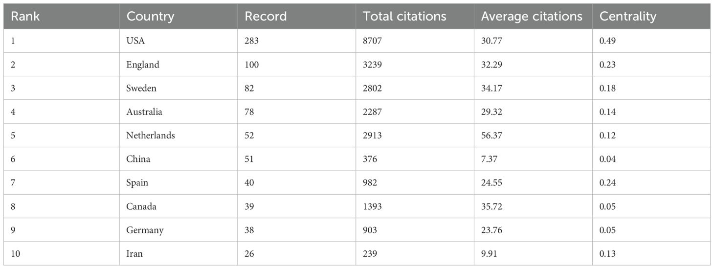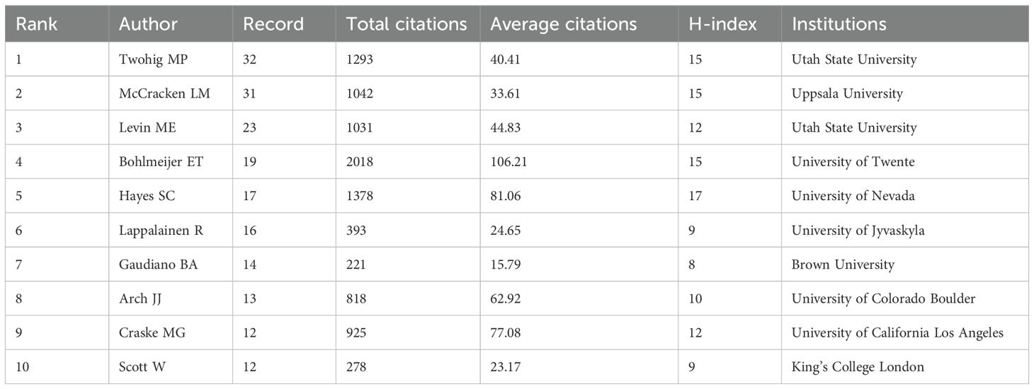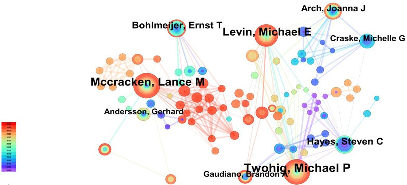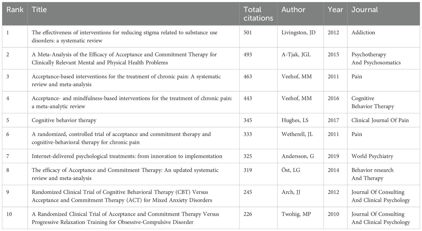 The analysis of publication output reveals a gradual increase in global cooperation. Data spanning 15 years demonstrates a notable year-on-year increase in the number of publications. Since 2010, the initial volume of publications was low and although exhibited slight fluctuations in the following years, it remained low level overall. Since 2018, the upward trend in the number of articles has been particularly pronounced, reaching a peak in 2023. This may be associated with the notable rise in the incidence of mental disorders worldwide during the COVID-19 pandemic, which has resulted in a significant public health crisis and intensified the imperative for the implementation of psychotherapeutic interventions (31). As research has progressed, ACT has been developing and innovating in terms of treatment technology, intervention mode, and so forth. Furthermore, the theoretical system has been continuously expanded and improved. This has resulted in an increasing number of scholars dedicating their research efforts to this field. Journal distribution analysis reveals that most publications emanate from psychology or medical journals. Among the journals, the Journal of Contextual Behavioral Science is the most productive, with a total of 94 articles (11.88%) and 1,157 citations. The Behavior Research and Therapy journal is the most frequently cited among the top ten, with 27 articles (3.413%) and 2,179 citations. Finally, the journals Behavior Modification and Frontiers in Psychology, have 19 articles each, representing 2.4% of the total. The works have been cited 713 and 241 times. The representative journals in question are primarily focused on the fields of psychology, behavioral science and medicine, and are committed to the study of human behavior, psychological intervention processes and health interventions. In the future, ACT research will continue to expand and deepen the field of psychology and behavioral sciences, and will also continue to validate and enhance the relevant theoretical basis and intervention methods. As the medical field increasingly prioritizes the mental health of patients, the collaboration between ACT, and the medical field will be further enhanced. Although there has been a steady increase in the number of papers published on ACT for mental disorders over the past 15 years, the quality of the publications remains unsatisfactory. In particular, the proportion of papers published in high-level journals (with an impact factor of more than ten) is remarkably low. To some extent, this reflects the fact that research on current ACT findings in the field of mental disorders still requires further strengthening in terms of depth and academic impact. Researchers are encouraged to direct their efforts towards the investigation of cutting-edge issues, to undertake more targeted and forward-looking research, and to proactively submit research results that are both innovative and in-depth. It is imperative to enhance the probability of publication of research results in esteemed academic journals, with the ultimate objective of elevating the overall academic status of research in this field.