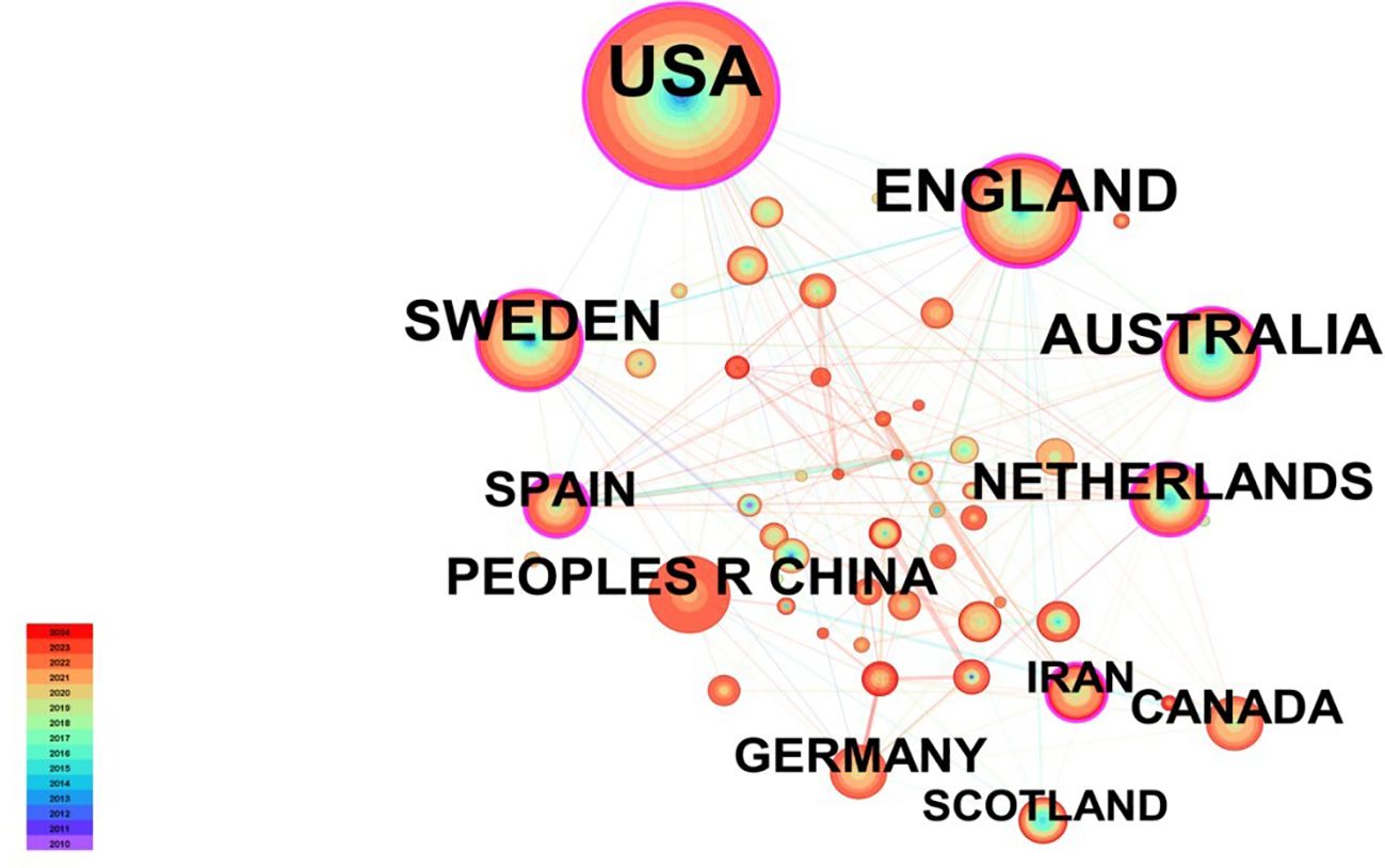 A total of 52 countries are engaged in research on ACT for mental disorders. The ten countries with the highest number of publications are presented in Table 3. The country with the highest number of publications was the USA, with 283 publications, accounting for 35.78% of the total number of publications. Its number of publications was much higher than that of England (100 papers), which was in second place, and Sweden (82 papers), which was in third place. In the network mapping analysis, the top three centrality values are USA (0.49), Spain (0.24), and England (0.23), indicating that these countries exert a significant influence and centrality in the field. Figure 4 shows the national collaborative co-occurrence network mapping, which comprises a total of 52 nodes (N), 170 connecting lines (E) and a network density of 0.1282. This suggests that approximately 790 articles were published by researchers from 52 countries and that 170 collaborations were established between these countries.