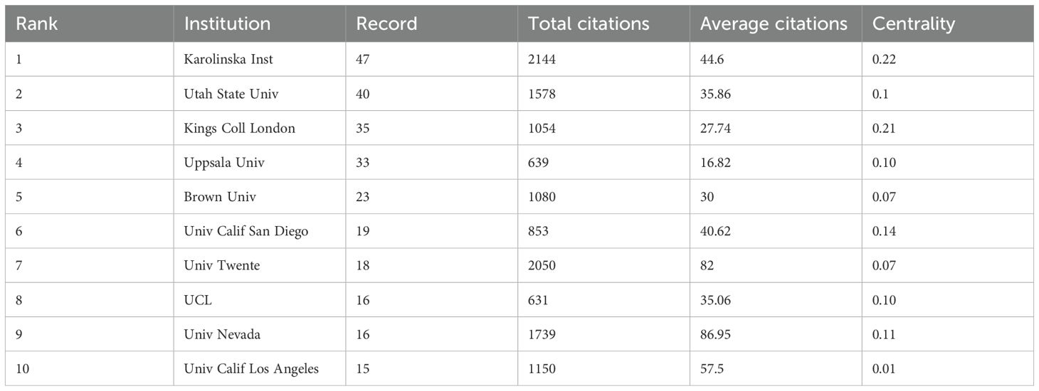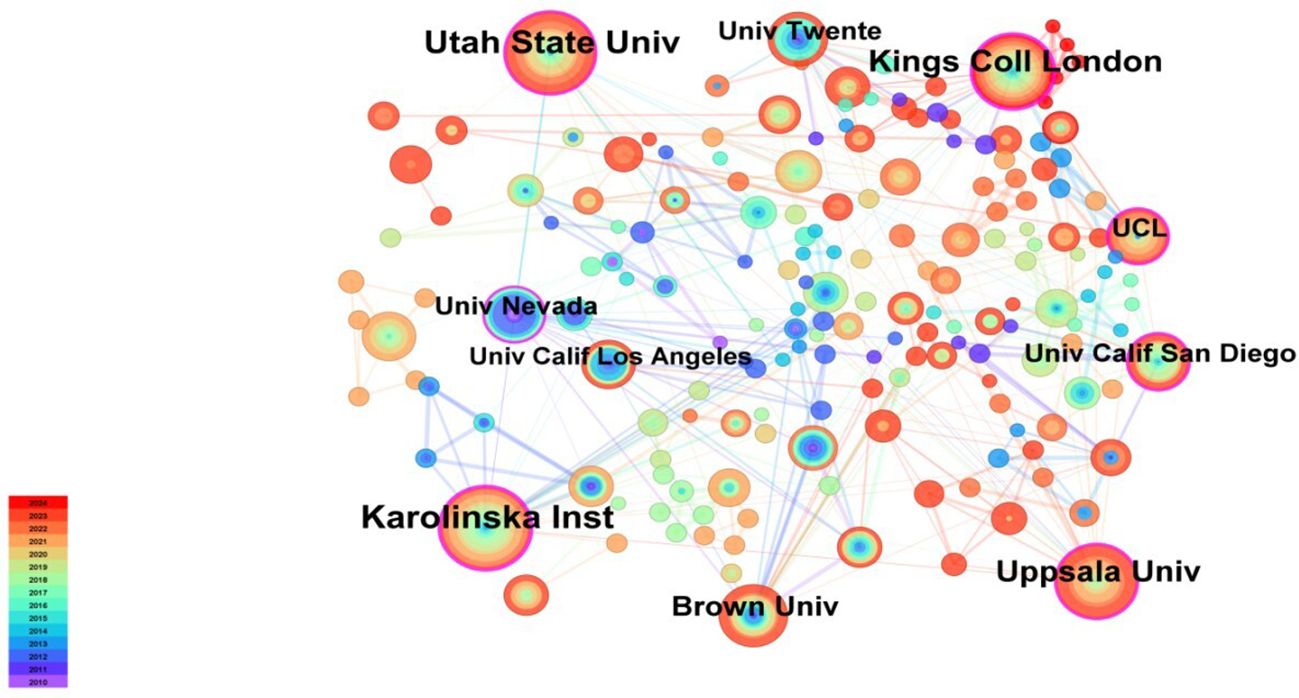 A total of 1,198 organizations were involved in research on ACT for mental disorders. Table 4 presents the top 10 institutions with the highest number of publications. The institution with the highest number of publications was Karolinska Inst in Sweden (47 papers). Utah State University and King’s College London were the second and third most prolific institutions with 40 and 35 articles, respectively. Of the top 10 institutions publishing the most, five are based in the USA, demonstrating the country’s significant influence and research strength in the field of ACT for mental disorders. Figure 5 shows the co-occurrence network of institutional collaborations. It can be seen that Karolinska Inst, the institution with the highest number of publications, has close collaborations with several institutions in the USA and the UK.