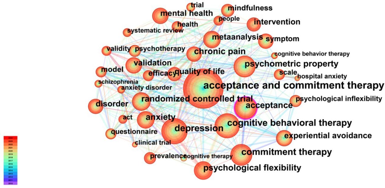 Keywords serve to reflect the core content of the paper to a certain extent and can be used as an important reference index for the analysis of research hotspots. The results of the keyword frequency analysis indicate this. Except for the keyword “acceptance and commitment therapy”, the other keywords with high frequency are focused on cognitive behavioral therapy (n=219), depression (n=227), anxiety (n=139), and randomized controlled trial (n=135). The high frequency of these keywords is indicative of the research focus and emerging trends in the field of mental disorders, specifically in the context of ACT.