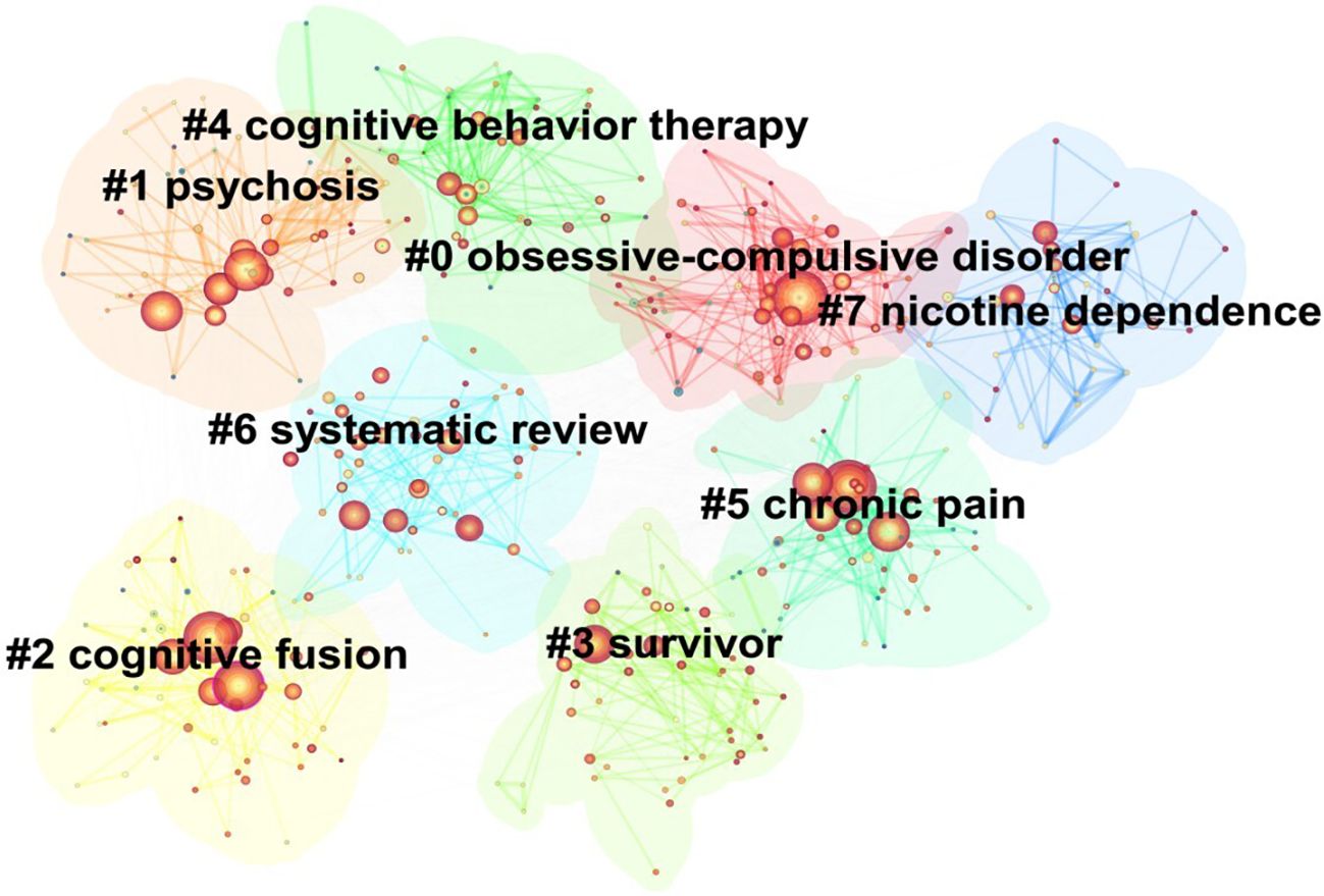 Cluster analysis was employed to group the 497 keywords into eight main clusters. Figure 7 shows the results of the cluster analysis, which are as follows: cluster #0 (obsessive-compulsive disorder), cluster #1 (psychosis), cluster #2 (cognitive fusion), cluster #3 (survivor), cluster #4 (cognitive behavior therapy), cluster #5 (chronic pain), cluster #6 (systematic review), and cluster #7 (nicotine dependence). The results showed that the keyword cluster exhibited a Q value of 0.3148 and an S value of 0.6528, indicating a significant cluster structure and high confidence in the clustering results.