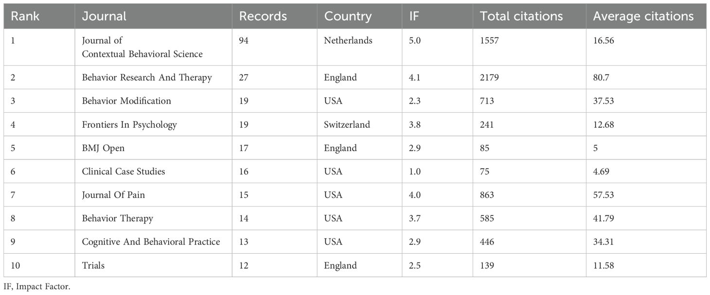 790 publications on the topic of ACT for mental disorders were published in 277 journals. Of these, 13 journals published more than 10 papers (34.89%), 101 journals published between 2 and 9 papers (44.76%), and the remaining 163 journals published only 1 paper (20.54%). In accordance with Bradford’s laws, in conjunction with the data from this study, the top 10 journals in terms of the number of articles published are designated as the core area journals. Table 1 shows in detail the top 10 journals in terms of number of publications and number of citations, most of which are from the UK and the USA, with five from the USA and three from the UK. Journal of Contextual Behavioral Science is the journal with the highest number of publications with 94 articles, accounting for 11.884% of the total number of publications. It has a citation frequency of 1,157 times. Behavior Research and Therapy comes second with 27 articles, and although it does not have as many articles as the first journal, it is the most cited journal with 2,179 citations. Behavior Modification and Frontiers in Psychology were both in third place with 19 articles each, representing 2.4% of the total number of articles, with citation frequencies of 713 and 241 respectively. Of these 10 journals, 5 have an impact factor higher than 3.0. The average impact factor of these journals is 3.2, which shows the influence and recognition of these journals in the academic community.