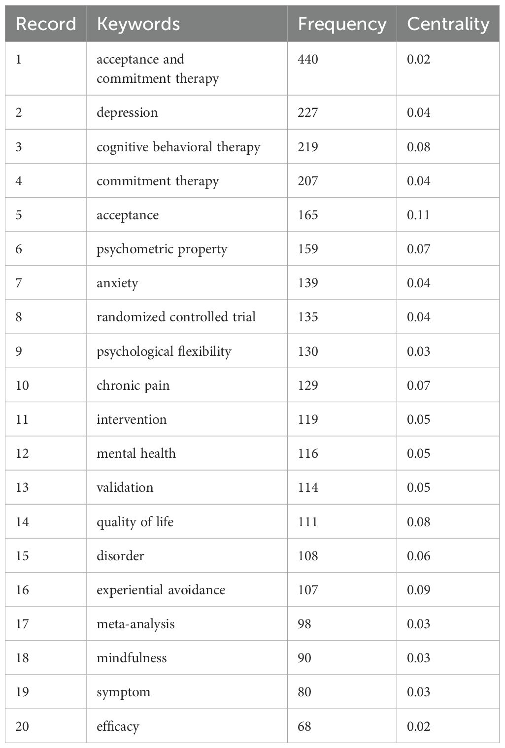 Keyword co-occurrence analysis reveals hotspots and trends in the field. A total of 38 significant keywords were identified based on the frequency of keyword occurrence. Table 6 shows the top 20 most frequently occurring keywords. The top five keywords were acceptance and commitment therapy (440 times), cognitive behavioral therapy (440 times), depression (227 times), commitment therapy (207 times), and acceptance (207 times). The keyword co-occurrence network map (Figure 6) comprises a total of 497 nodes (N) and 3,618 connecting lines (E), with a network density of 0.0294. This indicates that there are 497 keywords involved and 3,618 pairs of keywords with direct co-occurrence relationships between them, forming the core research network in this field.
