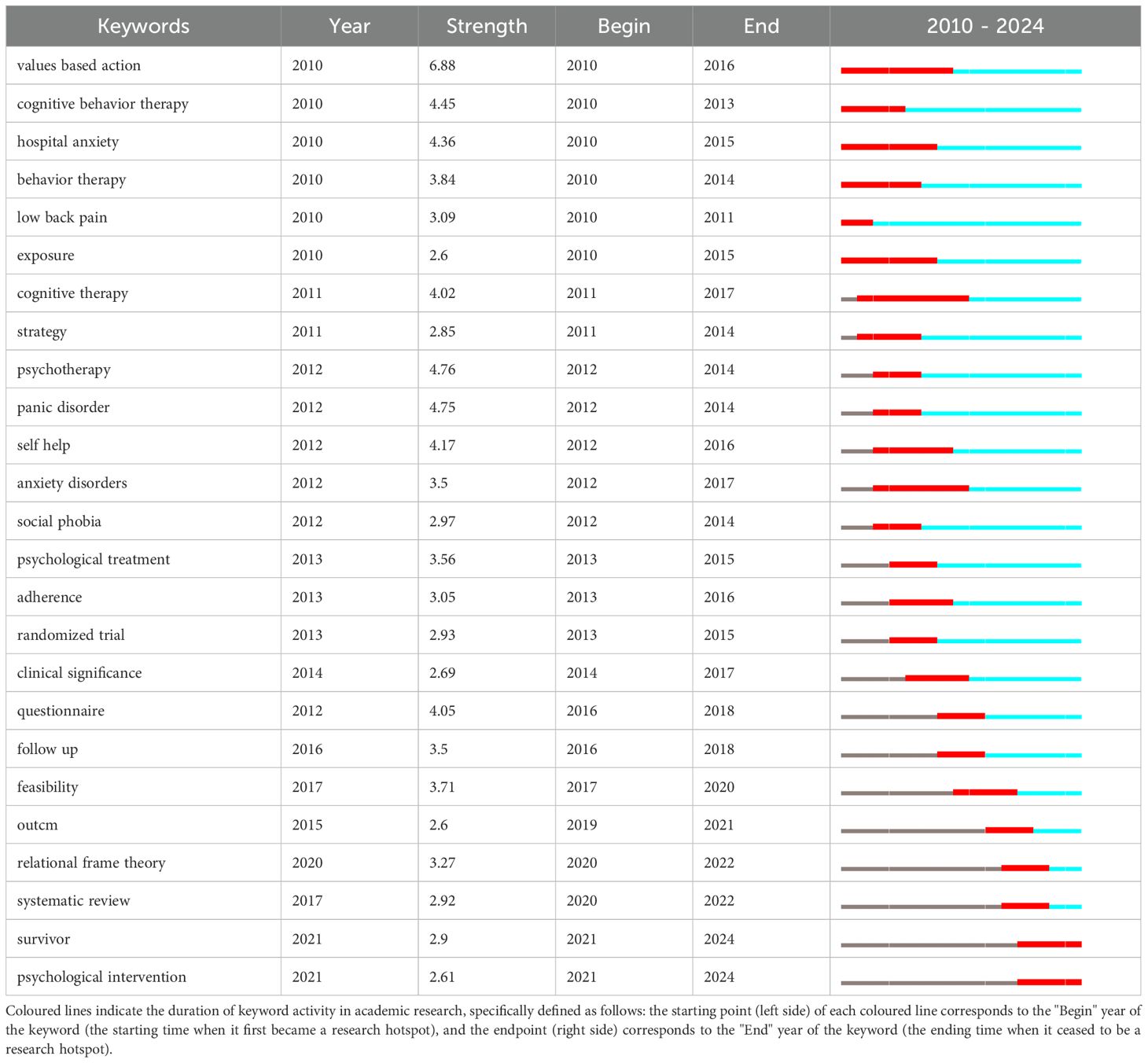 Table 7 presents the top 25 keywords in the field with the highest burst intensity of occurrence. The ten keywords with the highest burst intensity were: values-based action, psychotherapy, panic disorder, cognitive behavior therapy, hospital anxiety, self-help, questionnaire, cognitive therapy, behavior therapy, and feasibility. Among the keywords, values-based action has the highest burst strength, indicating a significant increase in the frequency of this keyword in a short period of time. The keywords with the longest burst duration are values-based action (begin=2010, end=2016) and cognitive therapy (begin=2011, end=2017). At present, the terms systematic review, relational frame theory, and survivor are emerging as new hot topics in the current research landscape. The current research indicates a trend of becoming new hotspots, which portends new directions for future research.