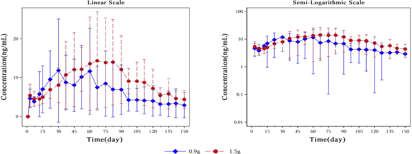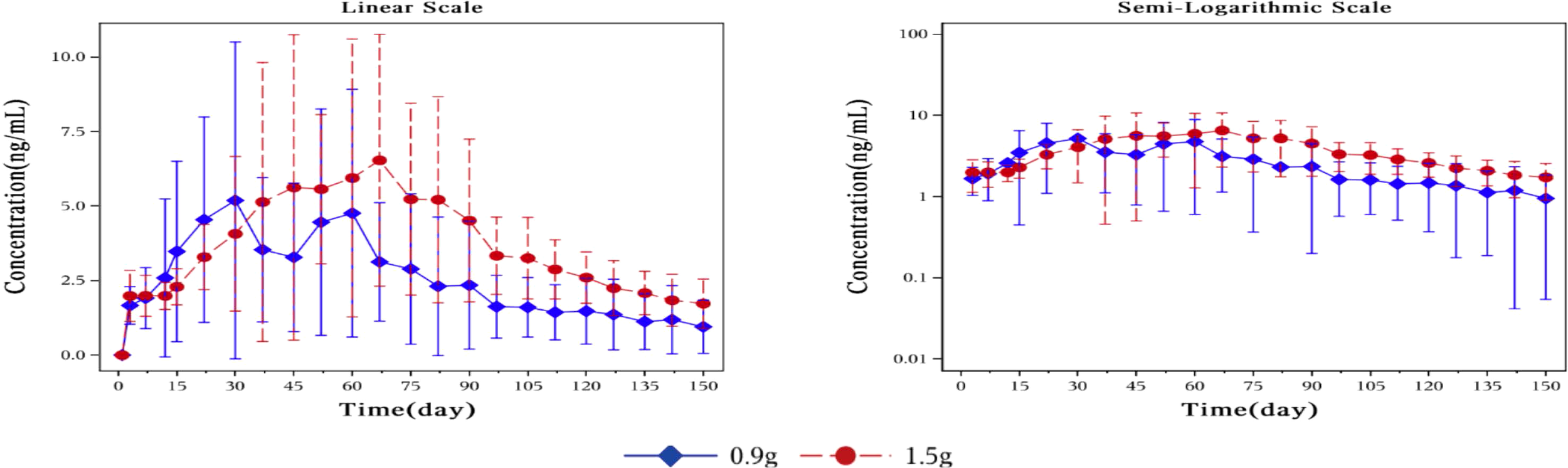 In the Phase I study of NTX-IMP, a total of 36 participants completed the trial. Based on the pharmacokinetic data from our phase I study, the plasma concentration of naltrexone at 0.75 g dose was below 1 ng/mL between 4 to 15 days after implantation, and exceeded 1 ng/mL between 22 to 121 days after implantation. Both the 1.5g and 2.25g groups exhibited stable plasma naltrexone levels, where effective levels of 1ng/ml were achieved within 4 hours post-implantation and maintained for approximately 150 days thereafter. Moreover, the maximum concentration (Cmax) achieved was approximately 10ng/ml. Oral NTX tablets displayed significant variability in plasma levels, reaching a Cmax of 20ng/ml but rapidly declining to near-zero levels after only 16 hours following administration. Given that the time duration during which the plasma concentration of naltrexone was greater than 1 ng/ml was similar between the 1.5g and 2.25g groups, we chose 1.5g as a high dose in our phase II study. The in vivo metabolism of naltrexone implants aligns with linear pharmacokinetics within the dose range of 0.75 g to 2.25 g. Considering that the plasma concentration of 0.75 g dose did not reach the minimum effective dose during the first 4 to 15 days after implantation, two dose groups of 0.9g and 1.5g were designed for our phase IIstudy.