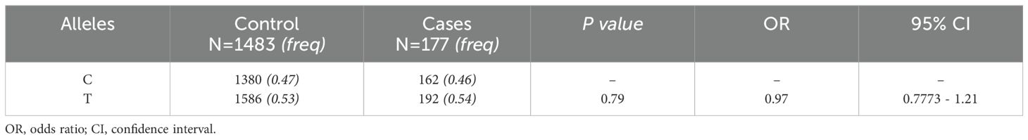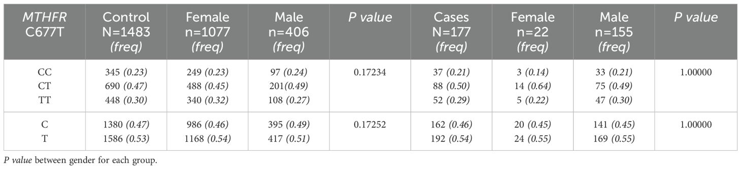 The human Methylenetetrahydrofolatereductase gene (MTHFR), located in chromosome region 1p36.3, encodes an enzyme involved in folate metabolism. Several single nucleotide variants (SNVs) on MTHFR have been linked to enzyme defects and different human diseases, including occlusive vascular disease, neural tube defects, colon cancer, and acute leukemia (9–12). Decreased MTHFR protein activity may affect the one-carbon metabolism cycle, which in turn might impair cortical and hippocampal neurogenesis during development and affect brain maturation and function (13). It has been reported that patients with ASD show a deficiency of the enzyme methylenetetrahydrofolate reductase and that after supplementation with traditional psychopharmacological treatment they had improvement in symptoms (14). The C677T SNV, among the most studied and clinically significant MTHFR variants, is located in exon 4 and involves the replacement of a cytosine by a thymine, leading to the substitution of valine for alanine at codon 222 (Zhang YX et al., 2022). Although previous reports have found an association of C677T SNVs with ASD (15–19) (Pu D et al., 2013; Rai V 2016; Wei H et al., 2021; Li Y et al., 2020; Sadeghiyeh T et al., 2019), most of these studies have been performed in populations with European or Asian ancestry, and admixed Latino American populations are strongly underrepresented. To bridge this gap, here we evaluated the association of the C677T SNV with ASD in a Mexican population.